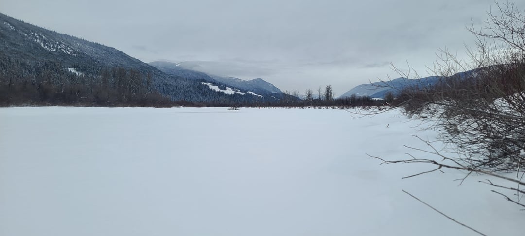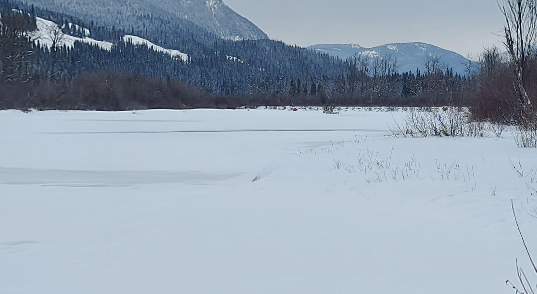 However, I'm very stubborn and hate losing things. I went back the next day for retrieval. To my amazement, I could see it with binoculars from the rec site. After bringing and riding the snowmobile about half way, I had to walk the rest along the side of the river. After about an hour trek bushwacking, I made it to my tent (not sure what shape I was going to find it in). To my amazement again, it was perfectly fine, with no rips tears or broken poles.
