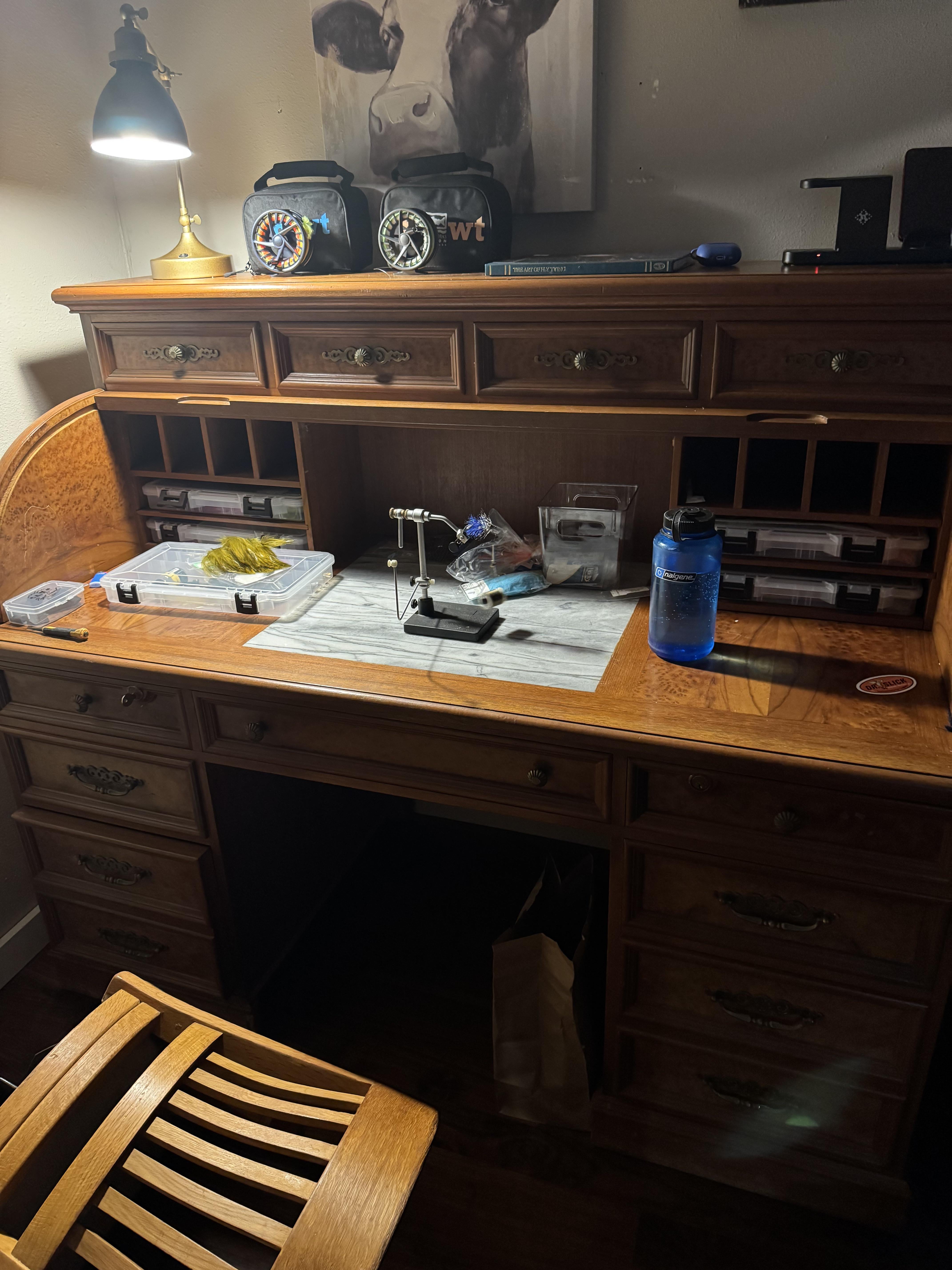 I absolutely love the roll top desk setups for fly tying. I’m so jealous. I wish I had room for one of these good looking pieces.