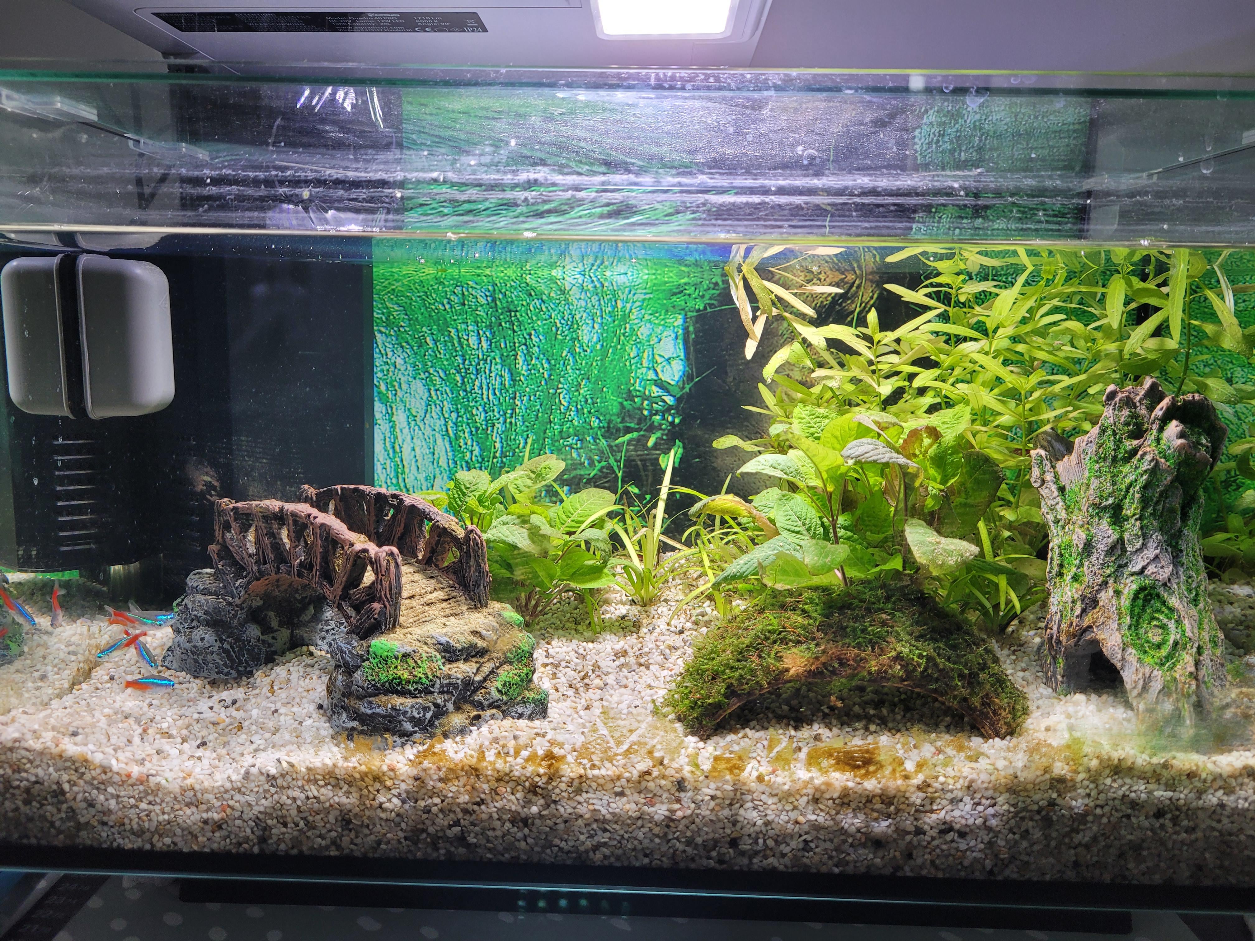 For a first attempt, this looks great! Good mix of plants and hardscape/decorations, and the neons add a nice pop of color. The moss-covered rock is a cool touch. Maybe adding a few more plants in the foreground would help fill out the space, but overall, solid start!