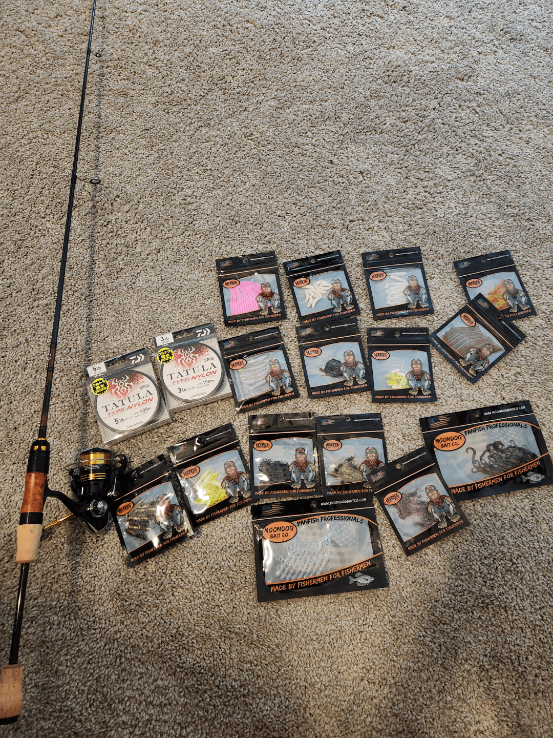 Rod: Daiwa Presso Air 6'6 UL Reel: Daiwa Legalis 1000S (JDM) Line: Daiwa tatula type nylon 3 & 5# (JDM) Lures are from moondog baits. They have pretty big selection of small lures for ultralight Posted by hotlikedimes7