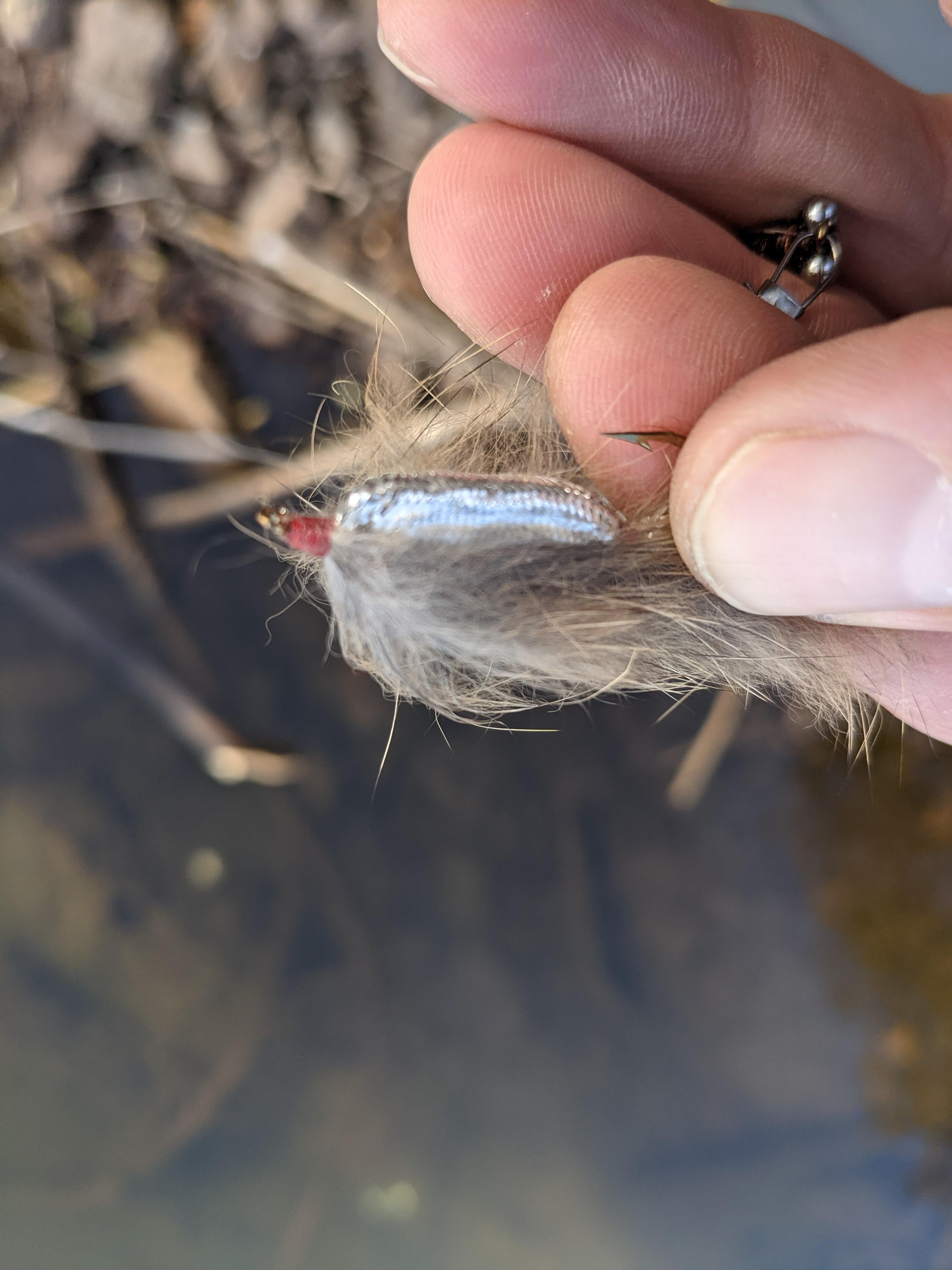 Silver Mylar body. Rabbit fur strip wing. Usually weighted with lead wire under Mylar. Red thread head. A streamer pattern called a zonker