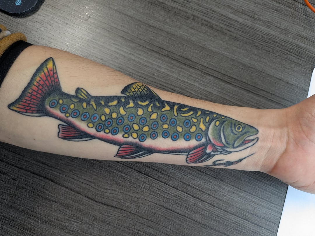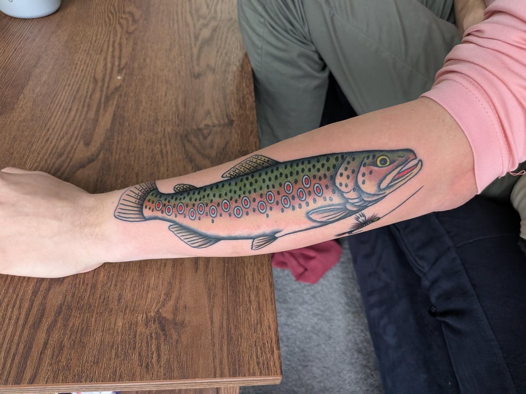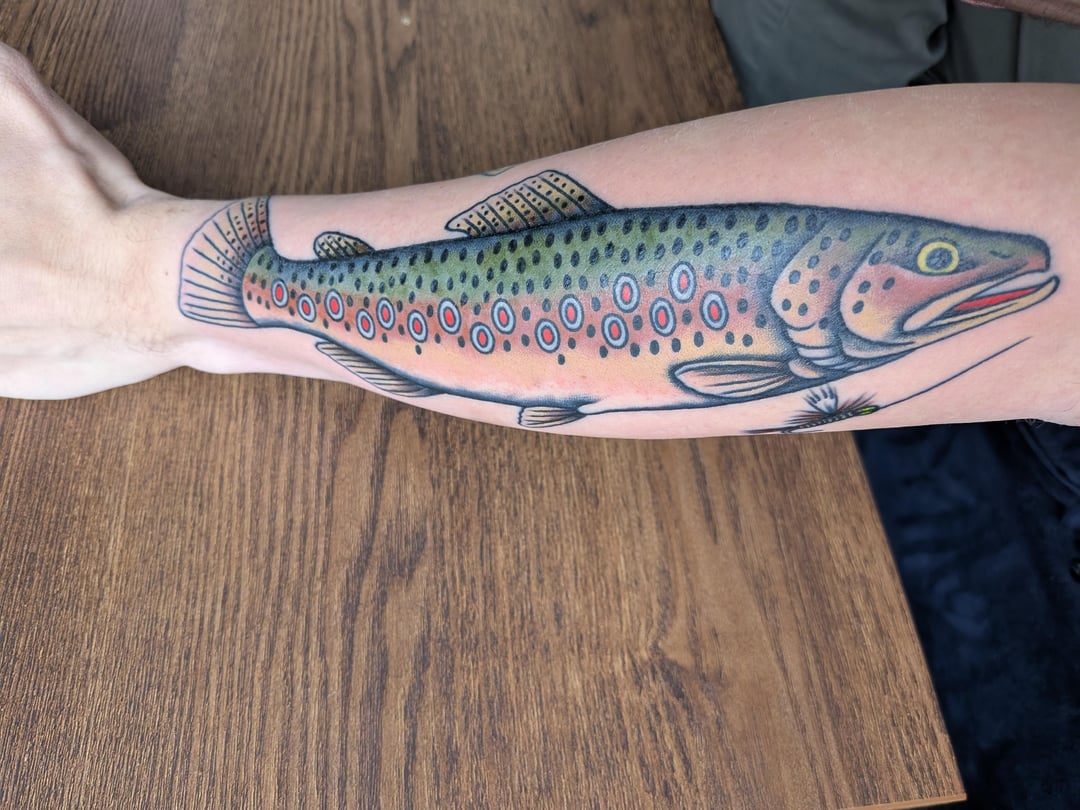 Looks cool, but unfortunately, that’s not a brown trout. It looks like a rainbow trout they added the brook trout spots to….