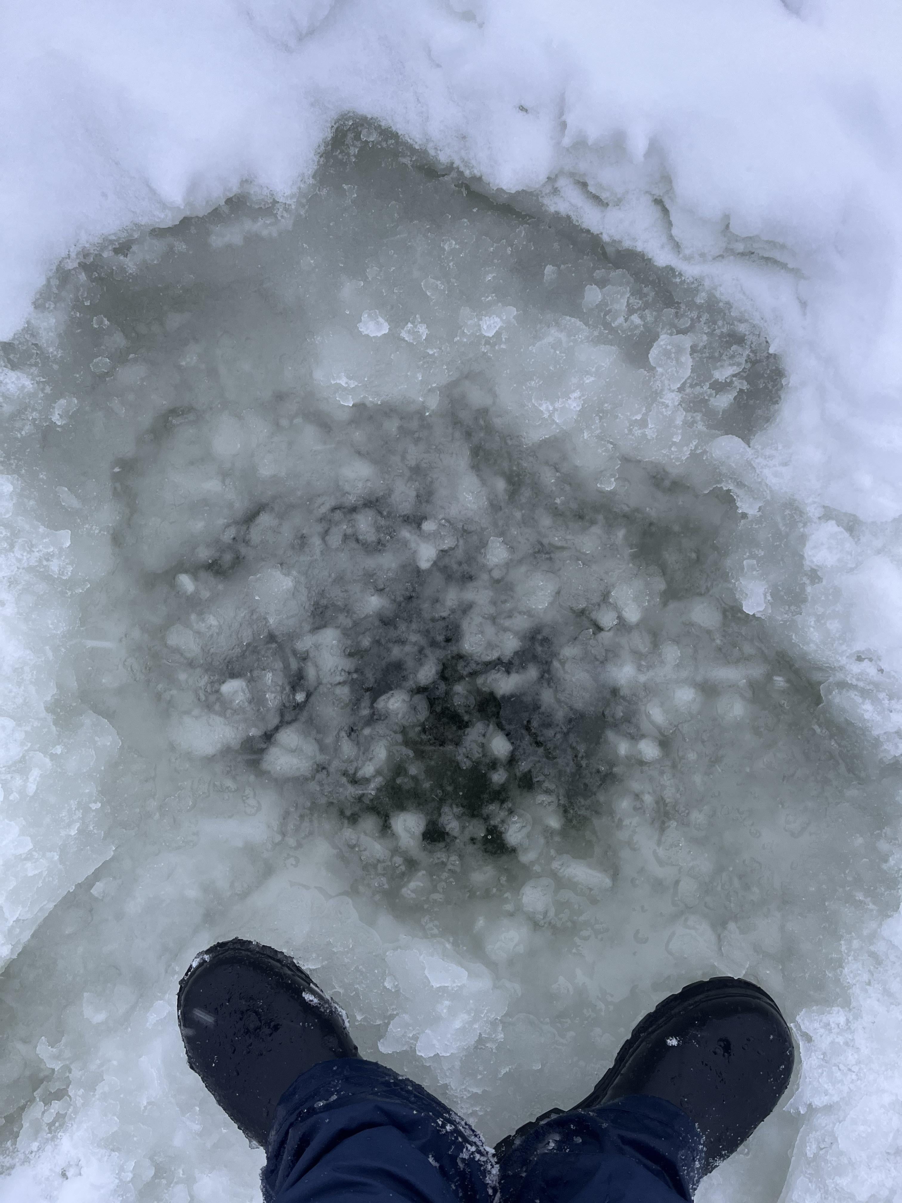I’m having a hard time believing it was an old hole. Our hut has been up since January, no one else has been fishing close to us. It’s not a perfect circle, inside there are frozen ledges (you can kind of see what I mean at the top left part of the hole). We’ve been fishing in this exact spot for eight years and have never had something like this pop up so I don’t think there is a natural spring. I didn’t stay close to it long enough to do much measuring but I was told that there was ice underneath (about eight inches down) but I’m questioning if that person was right because I sunk all the way to my knee when I stepped in it. There was no ice breaking or anything, it was covered by snow and slush so I didn’t see it.