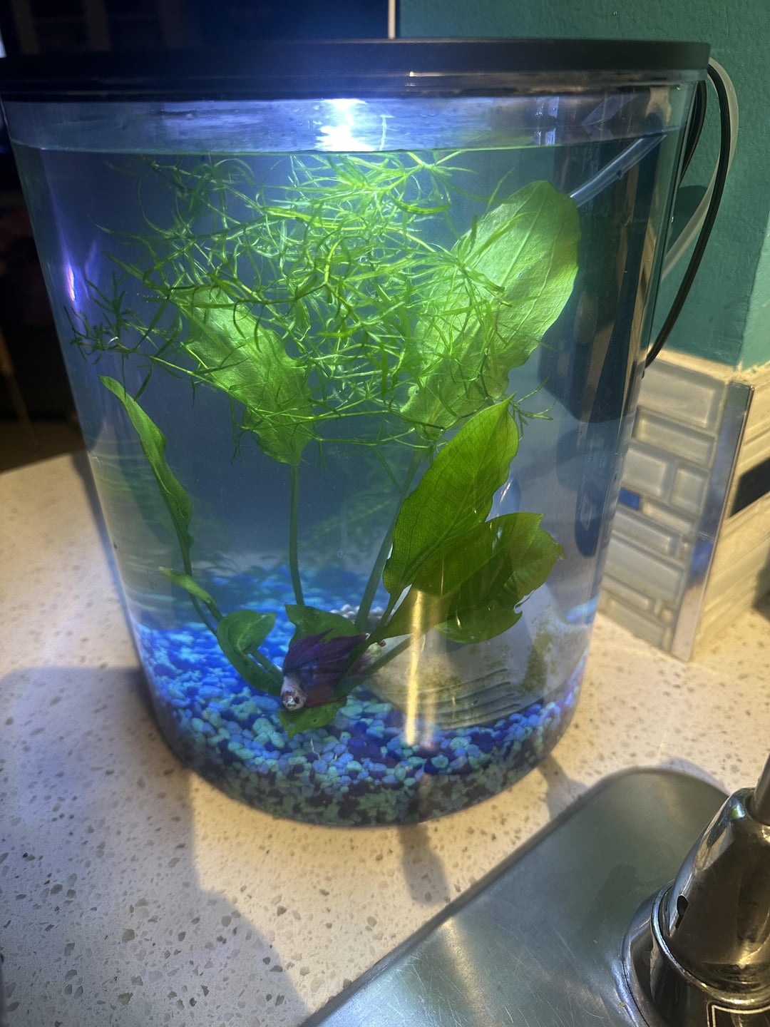 I added real plants and added a small sponge filter from my shrimp tank .. he has huge fins so tomorrow I’ll get him one of those leave things that float if needed so he can be on it … he’s laying on the plant is he okay besides the obvious stressed out of his mind …