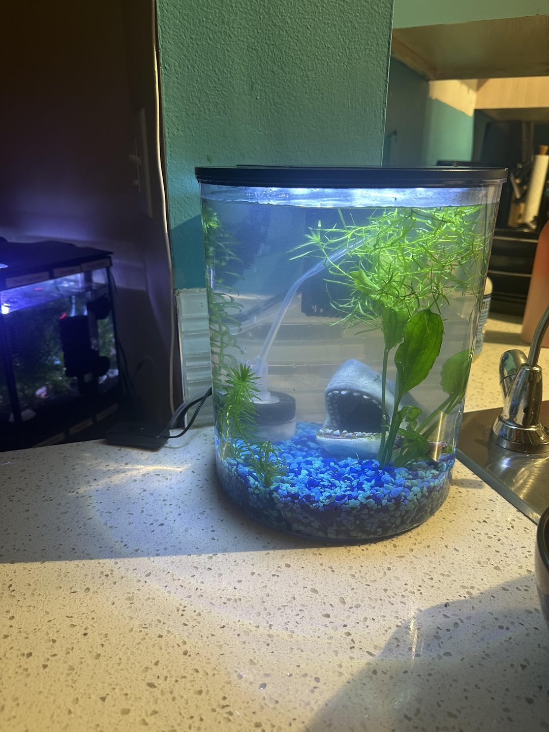 My wife found this cutie for free on Facebook , my question is … is he okay in his 2.5 he was in , we moved most his water with him but don’t think it was super great so did add some fresh RO water in it …