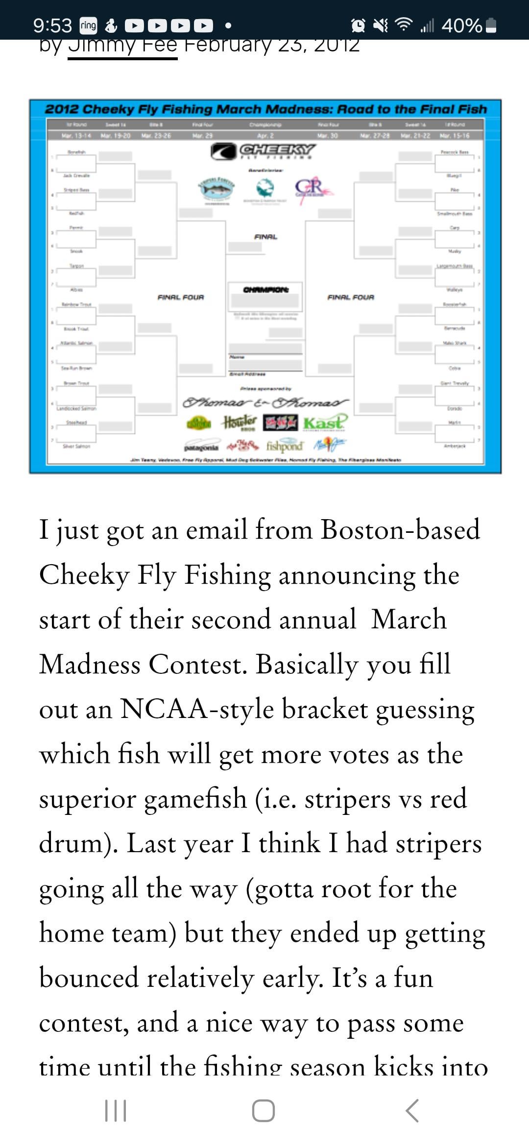 I am trying to put together my list of top 10 fishing trips. I remember participating in this bracket but can't find the results online. Anyone have a copy of the final bracket? Posted by WfPatrick
