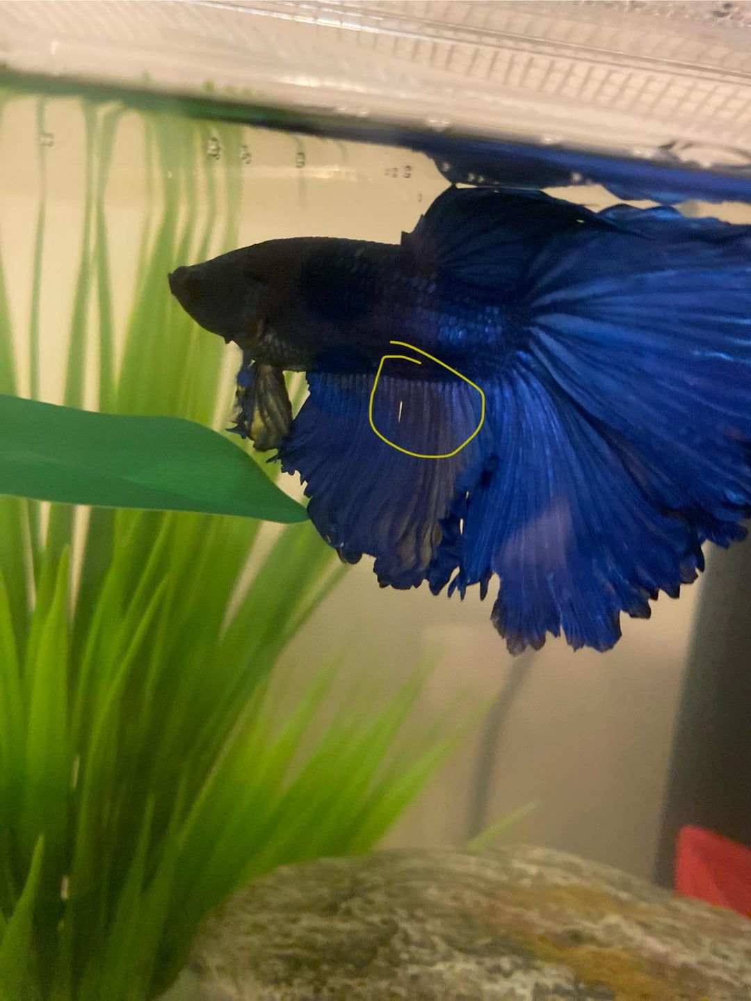 probably a tare (i don’t know how to spell it lol) from something sharp in the tank. i had a beta like yours with very long and thin fins which got tared easily so you have you make sure there’s so hard surfaces. i heard you should get women’s tights and put them over any decor and if it rips them then it’s too sharp for the fish. i recommended giving him some medacin just to make sure it doesn’t get infected or get worse