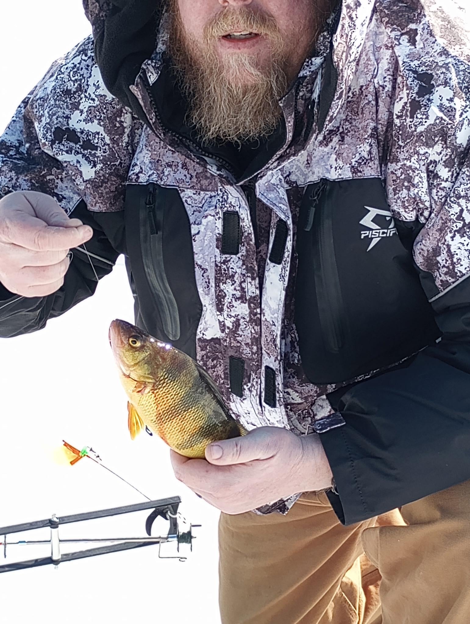 Got a chance to fish a private late today. 13" of ice, 20+' of water. Got on some good size perch. Posted by angryjmar