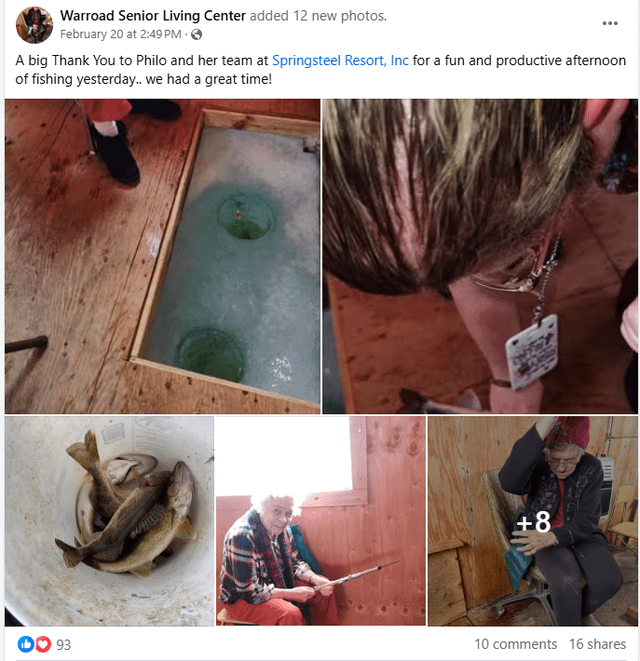 1. Saw this awesome post on Facebook last week and thought I’d share. The folks at Springsteel Resort on Lake of the Woods hosted a day trip by a group from the Warroad Senior Living Center. Looks like they had a great time- they even took them out to the fish house by bus. Lots of ice out there this winter!