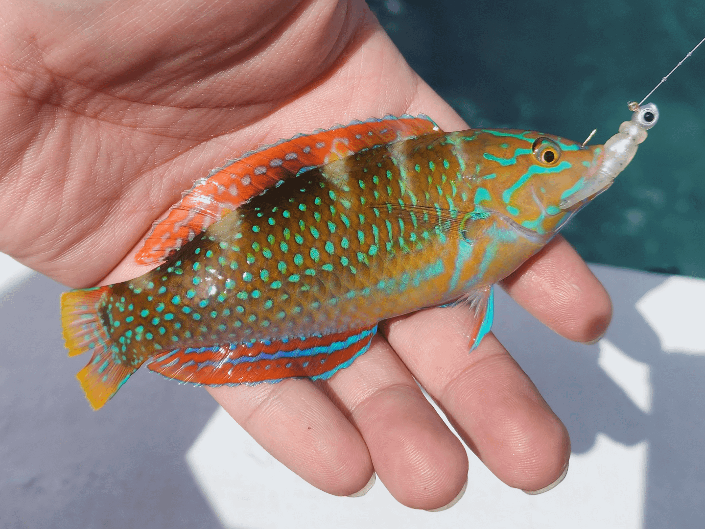 Caught this colorful guy on the north coast of Jamaica in Runaway Bay. Caught on a Daiwa Presso 4 piece UL rod, Daiwa legalis 1000s with 5lb braid, 1 gram Daiwa jighead, Mule Fishing minnow 1.2in soft plastic. Awesome looking fish.