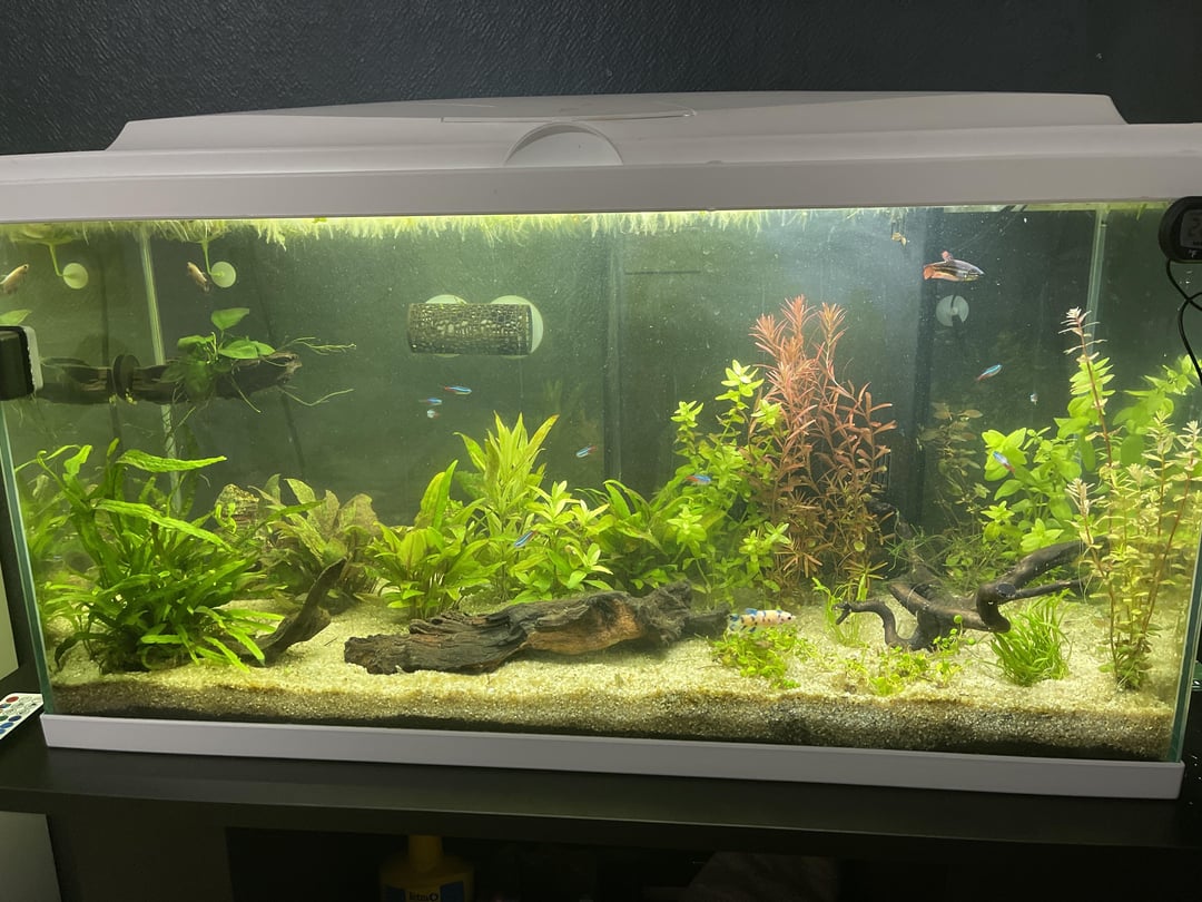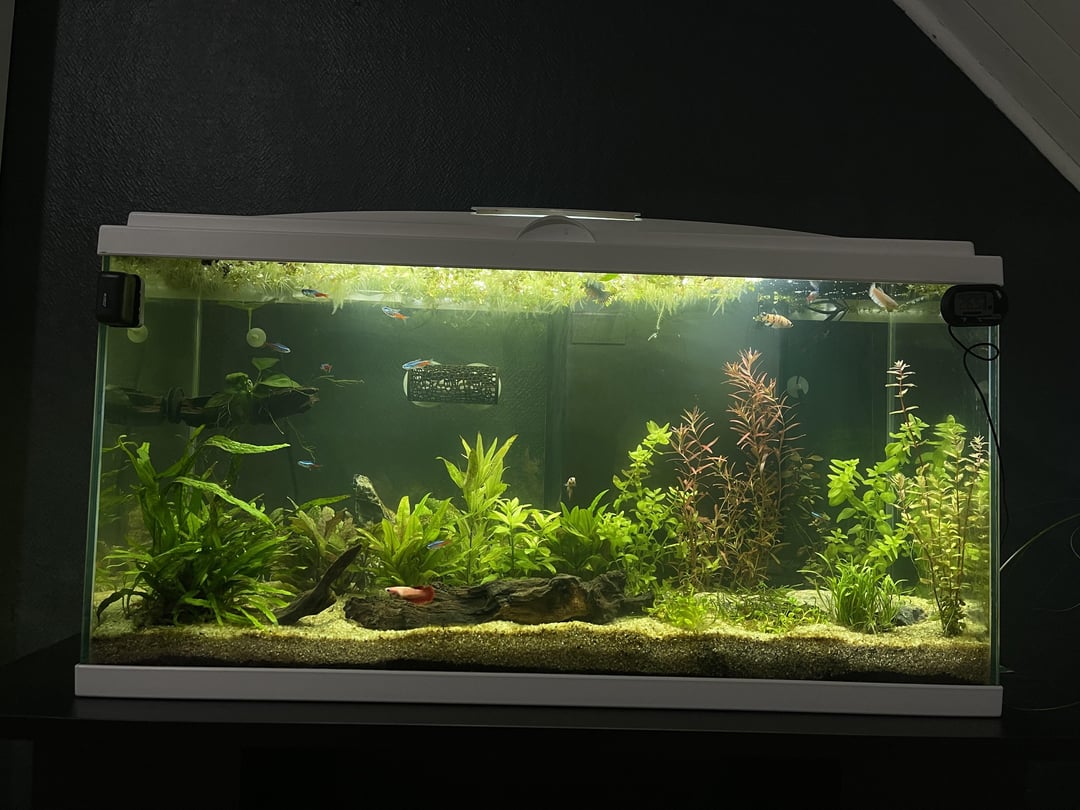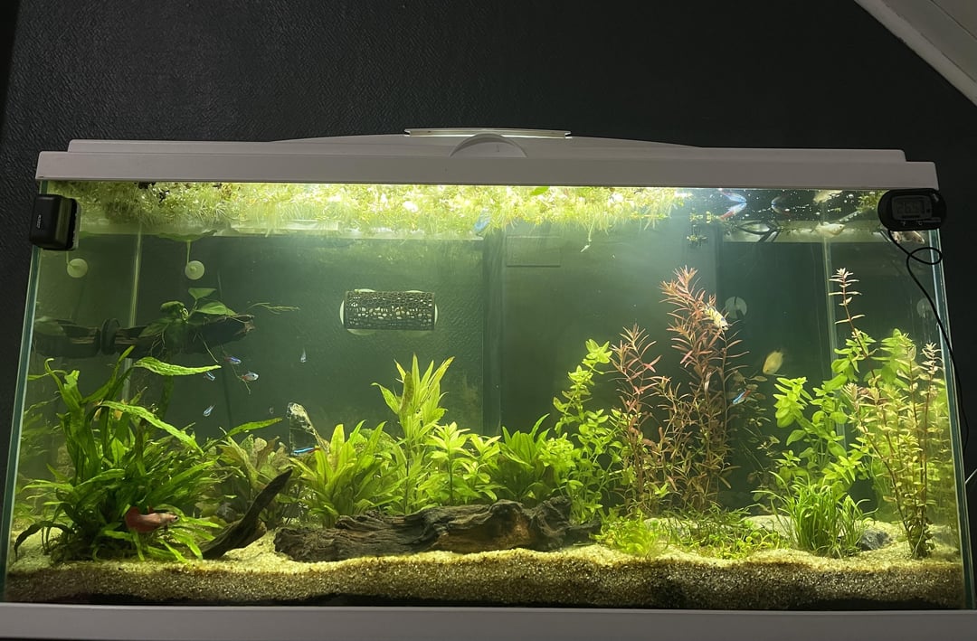 I've had this aquarium for over a month, and it contains 7 female bettas (10 neons and 2 honey gouramis). What do you think of it? Any ideas for improvement?