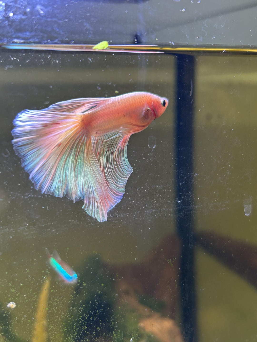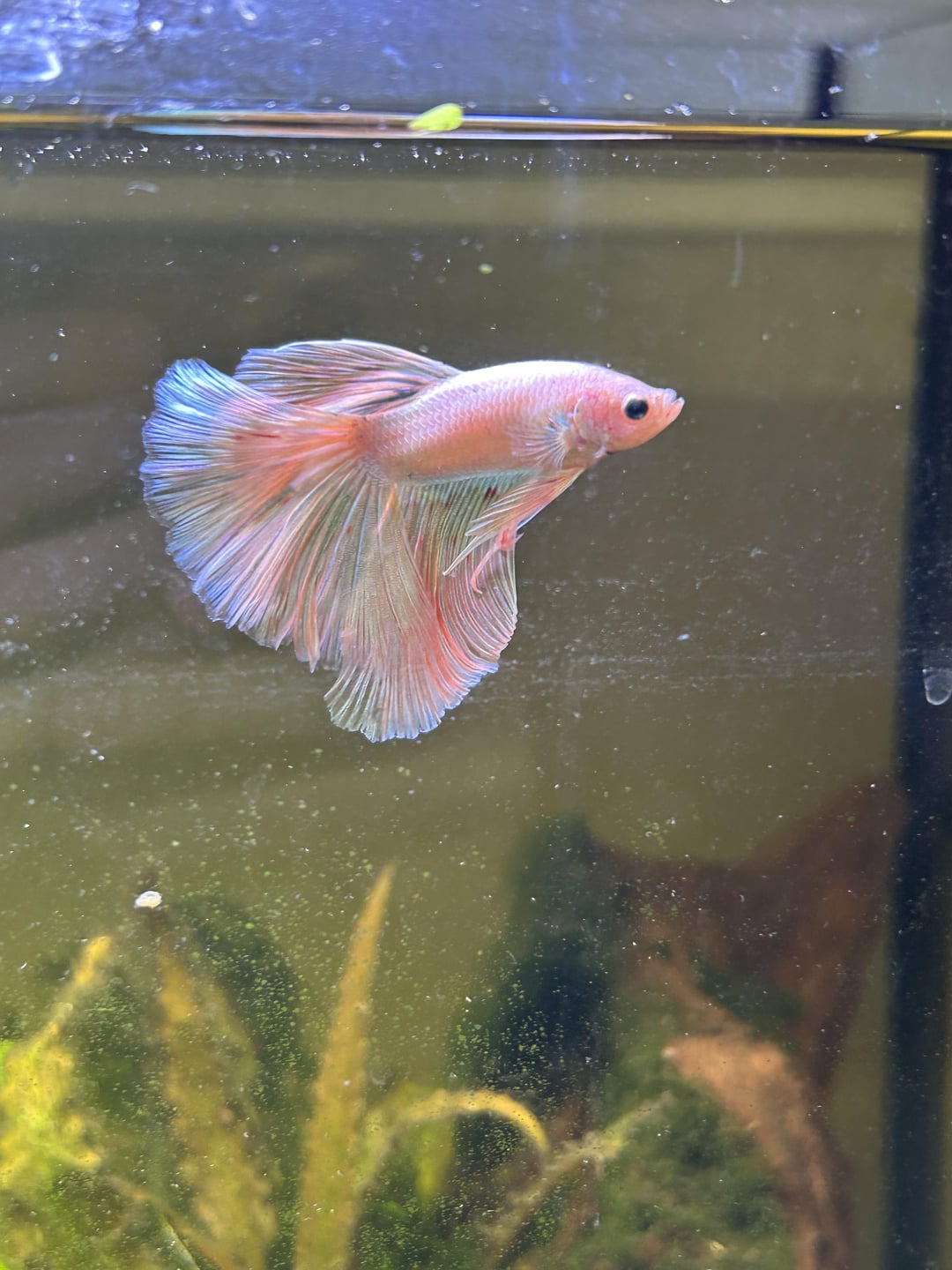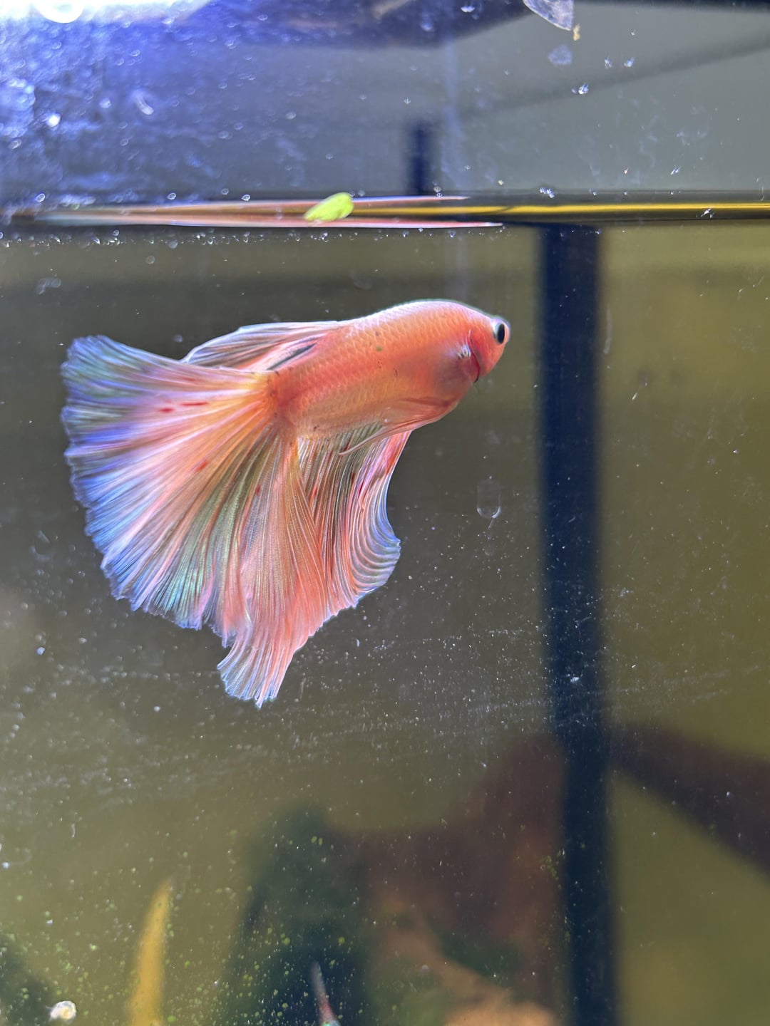 Saw him at the fish store and literally couldn’t resist. I was not planning on buying another betta after my previous boy died of SBD. But after see thing this little guy, I had to get him. Been taking photos and videos of him for the past one hour help. Name suggestions welcome!