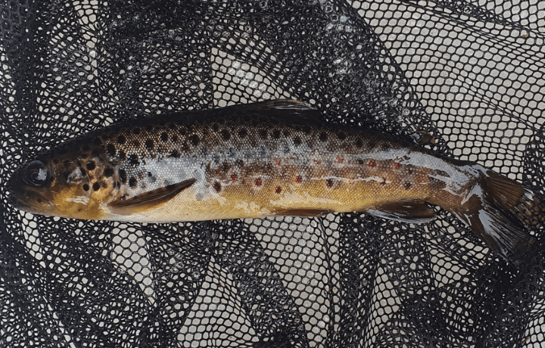 After I've hooked and lost 4 trout I finally got one in the net. Took on a olive hares ear. The brown trout don't get very big in this river but they are beautiful! Posted by jommpa99