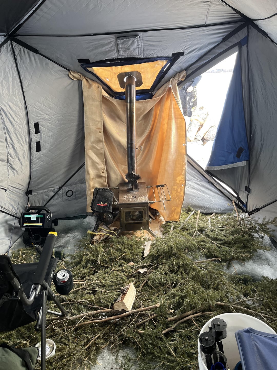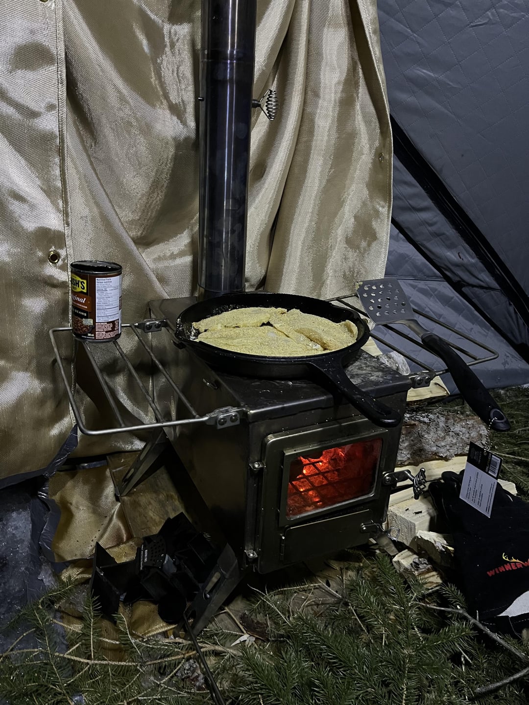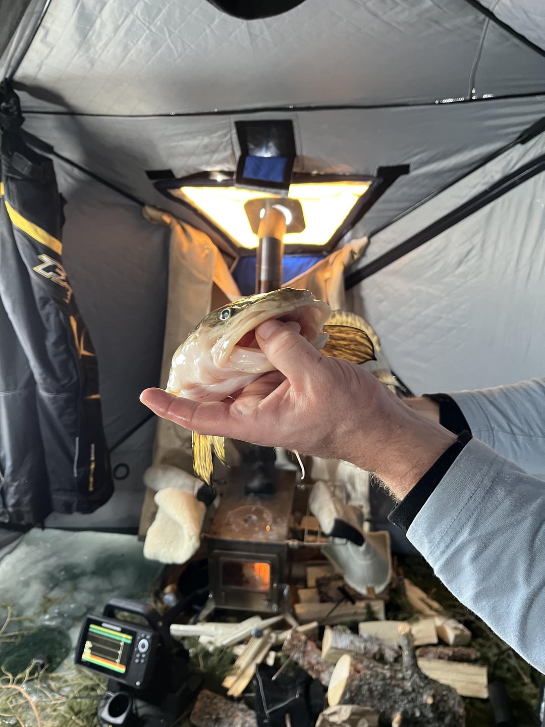 My buddy and I drove 5 hours into northern Saskatchewan then travelled by snow machine to where we set up camp for a couple nights. We caught lots of walleye, burbs and perch. Had fish fry’s and a few laughs. Seen a black wolf Saturday morning that was around our camp once I inspected his fresh prints.