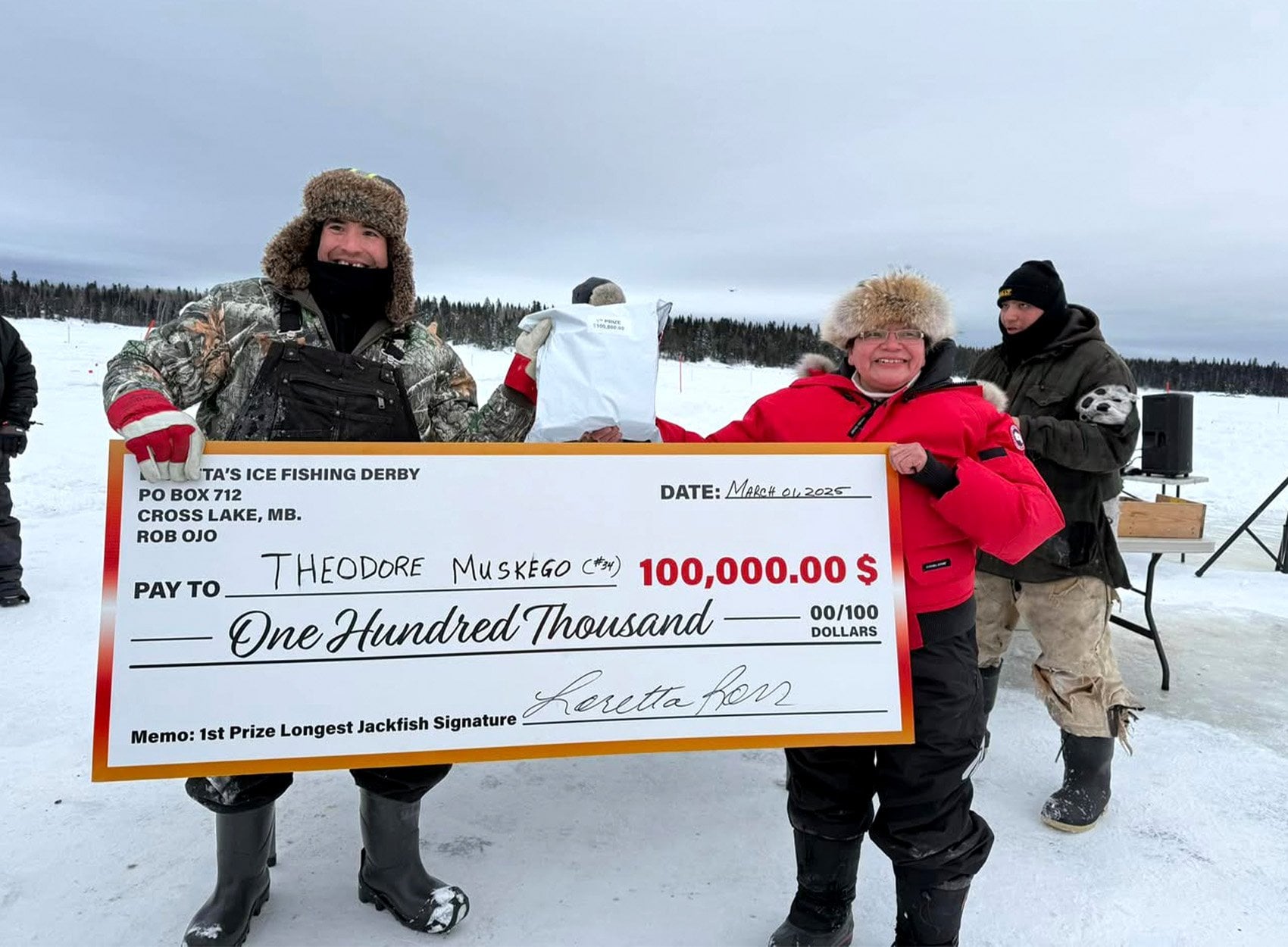Among the 500 anglers participating in a Manitoba ice-fishing derby last weekend were Muskego and his dad Glenn. They’d driven 500 miles to Cross Lake from their homes near the Alberta-Saskatchewan border to compete. With just a few minutes left in the derby, Muskego hooked giant pike, his biggest fish of the day. As time was running out in the one-day event, Theodore struggled to land the fish, which still had to be measured to be considered for the cash prize. With only seconds left to enter his fish, Theodore, who was wearing heavy winter clothing and boots, put his big pike in a bucket and ran as fast as he could to the derby’s measuring station. Other anglers and onlookers cheered him on. He made it to the station with just 35 seconds left on the tournament clock. The 39-inch pike won him a check for $100,0000.