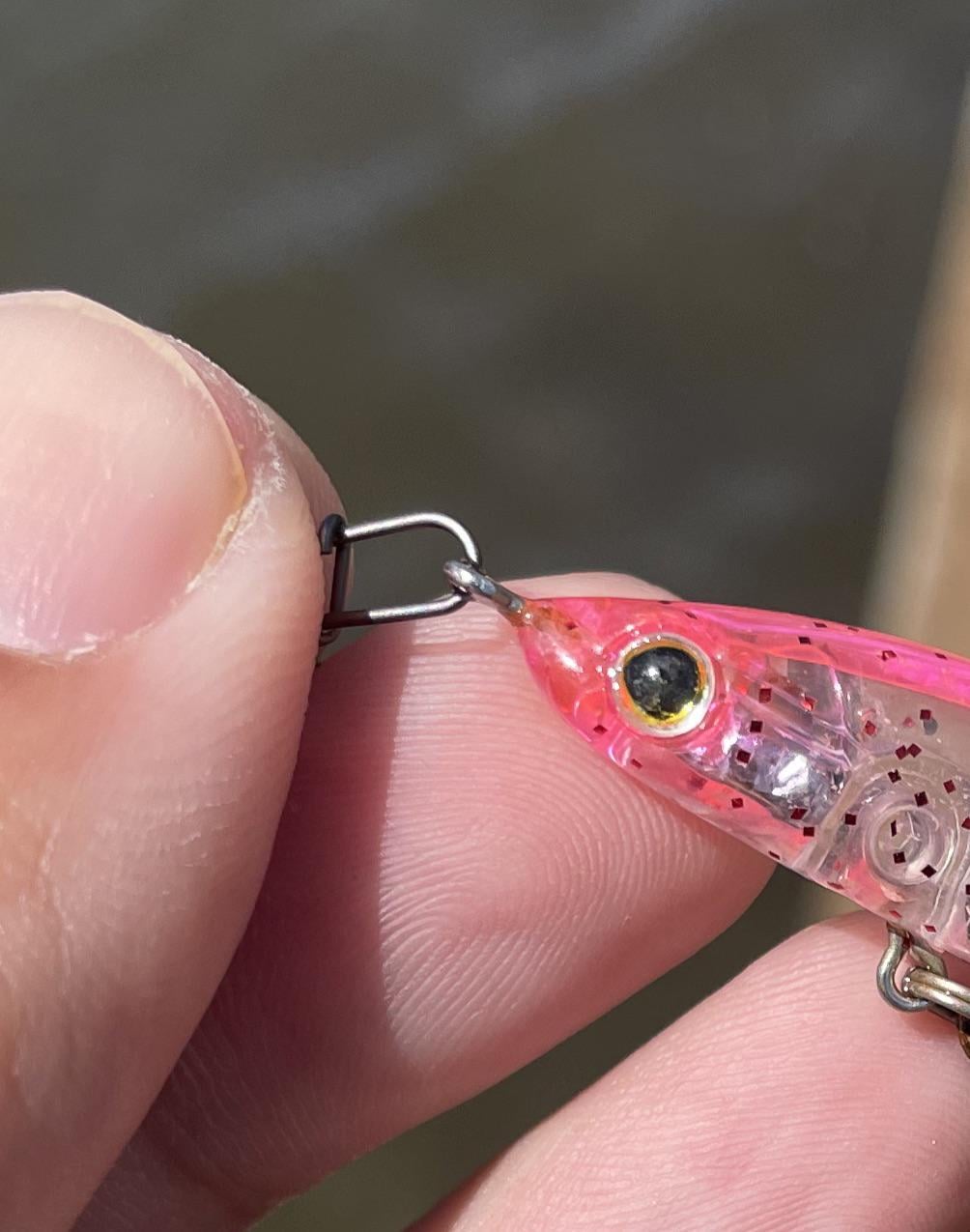 So I started using the Duel LG Sinking Pencil 50 for ultralight and the Duo Bay Ruff Seek 85 for Medium gear both of which come with a horizontally-oriented wire loop/eyes. Results have been great!
