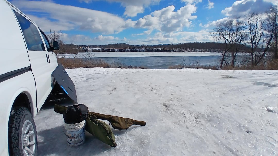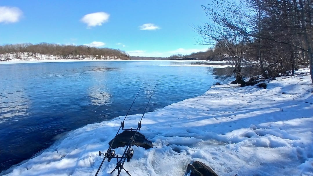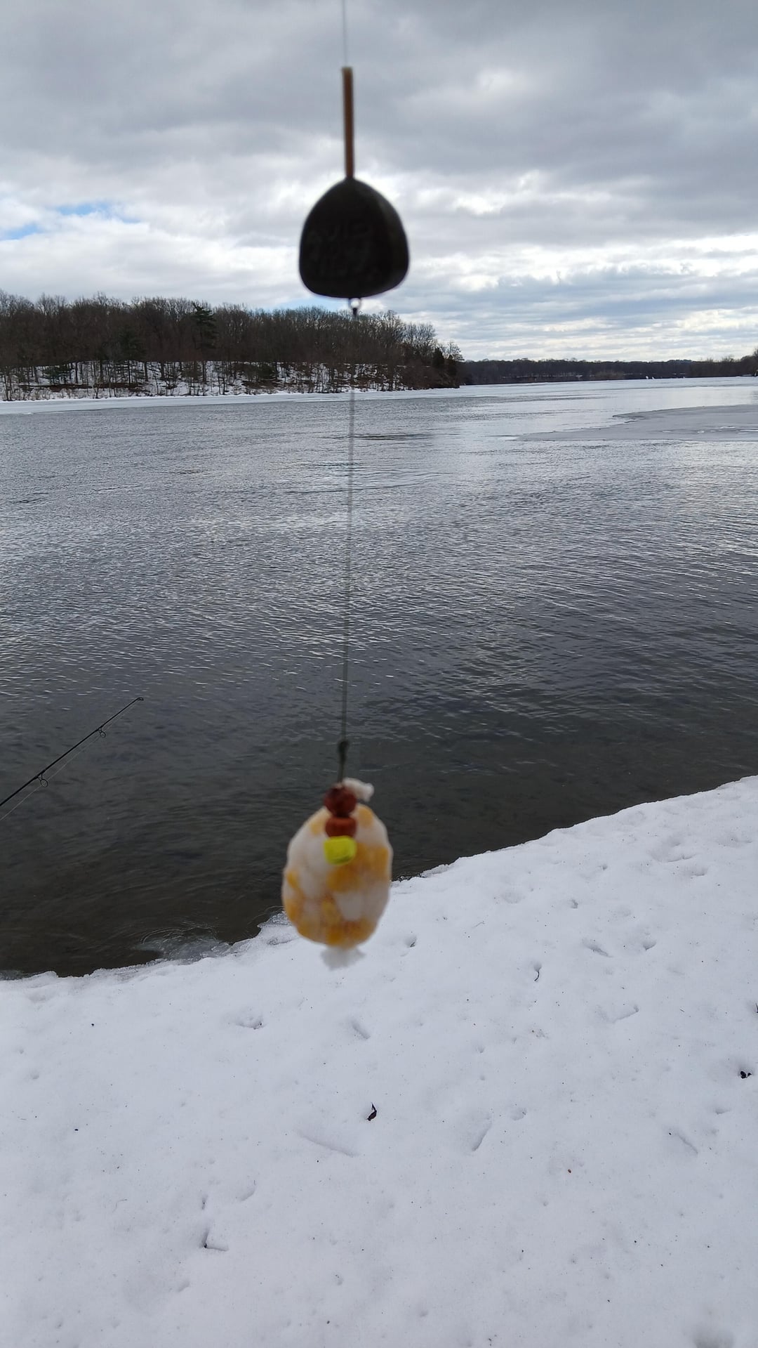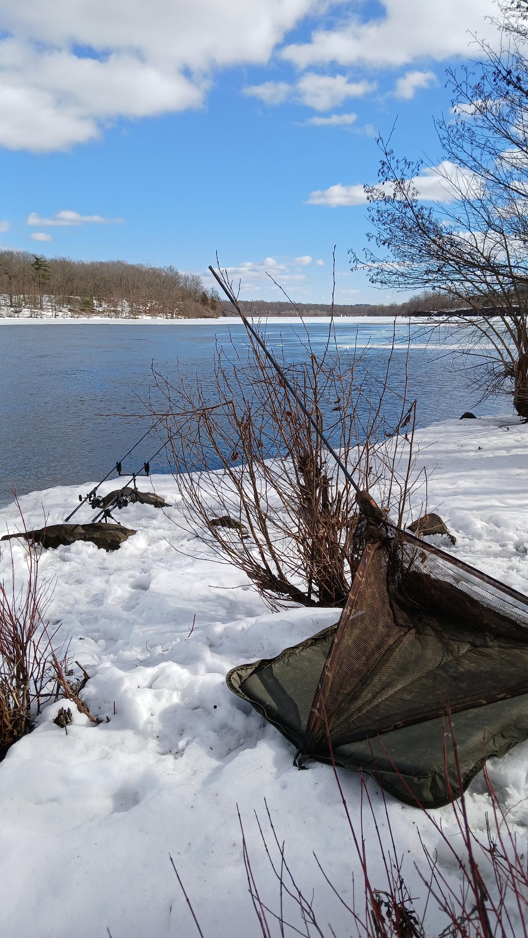 I haven't given up but only fish when the weather is tolerable. This is at the exit of a power plant and is the only water that isn't frozen. A week of spring like weather is coming so I've been trickling in some feed and preparing rigs.