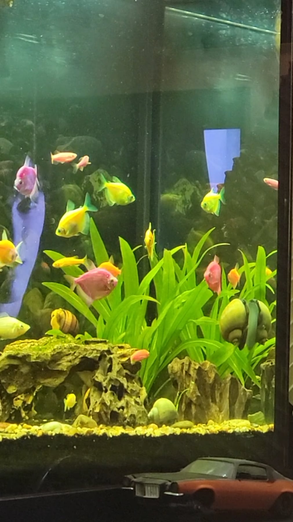 Love the community. Debating upgrading to a 75 gallon. I started this 55 gallon with false decorations and plastic plants. It has standard black sand as substrate with root tabs bedded into it. I'd love to build a 75 gallon upgrade with a good plant substrate and heavy plant concentration. Will eventually switch from glow fish but letting these live out thier lives first in a nice tank.