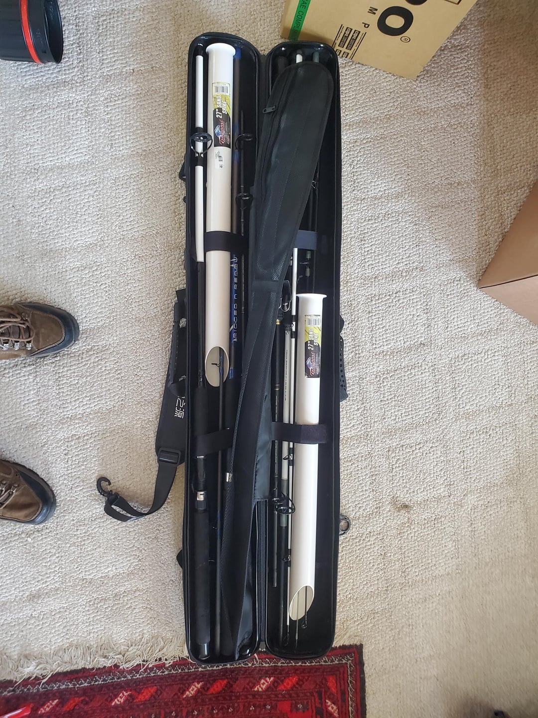 I ordered a clamp shell style hard sided rod travel case a couple weeks ago. Temu sent me a message that the case couldn't go by air, and would be going by boat, and theyngave me a 15 day delivery window. So, I went and bought a drawing tube style carrier to transport my rods on one of my fishing trips. Amazingly the case showed up,,and I really like it. 2 of my rods were too long and I ended up cutting an inch off on rod at the butt, and two inches on the other rod. Now, I can carry 5 rods and 2 sand holders. Thought you folks might be interested to see. Not a Temu endorsement, it was the only place I saw a rod holder like this.