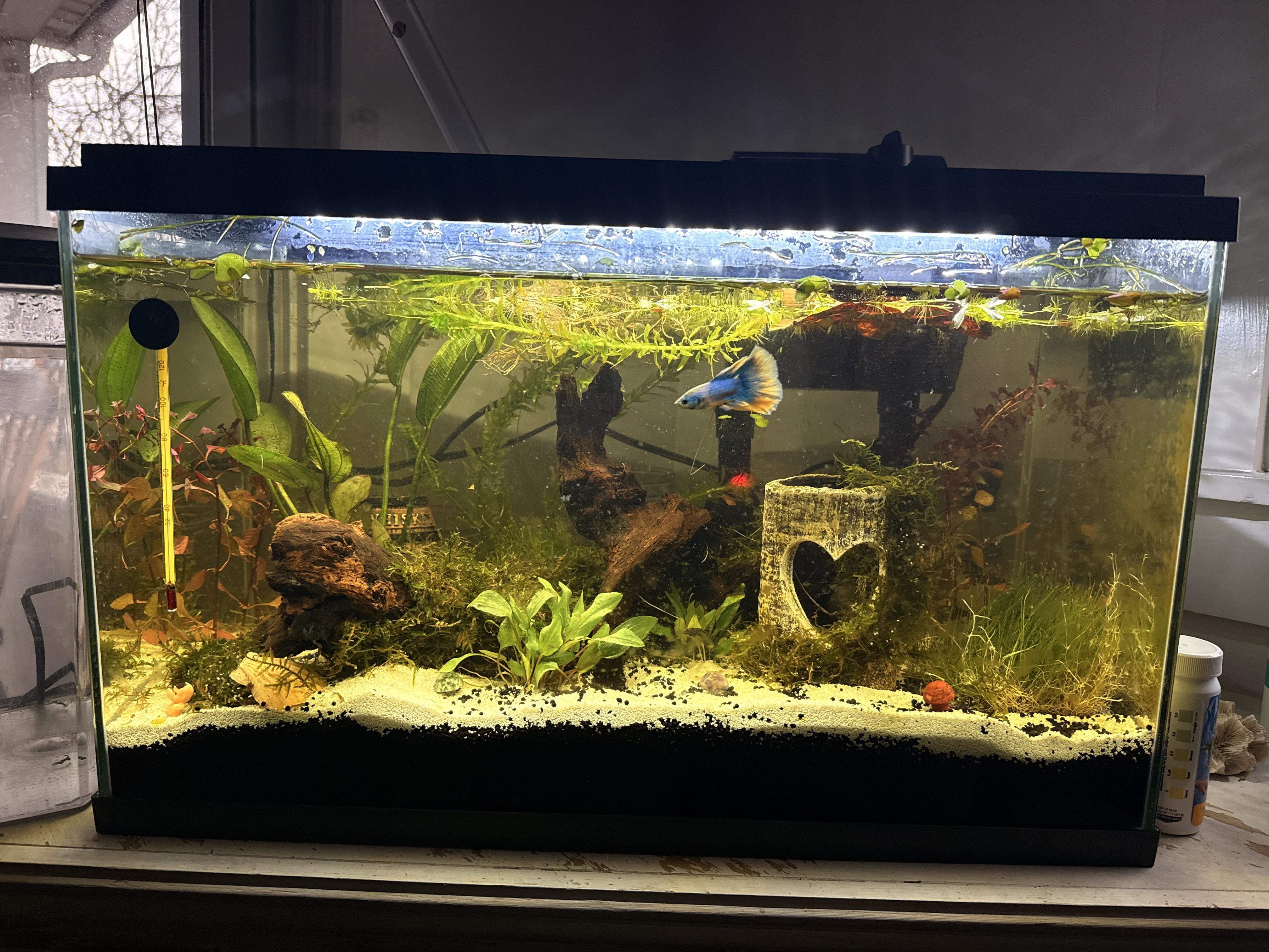 Plants: christmas moss, java moss, cryptos, egeria densa, ludwigia natans, dwarf hairgrass, amazon sword, duckweed, giant duckweed, red root floaters
