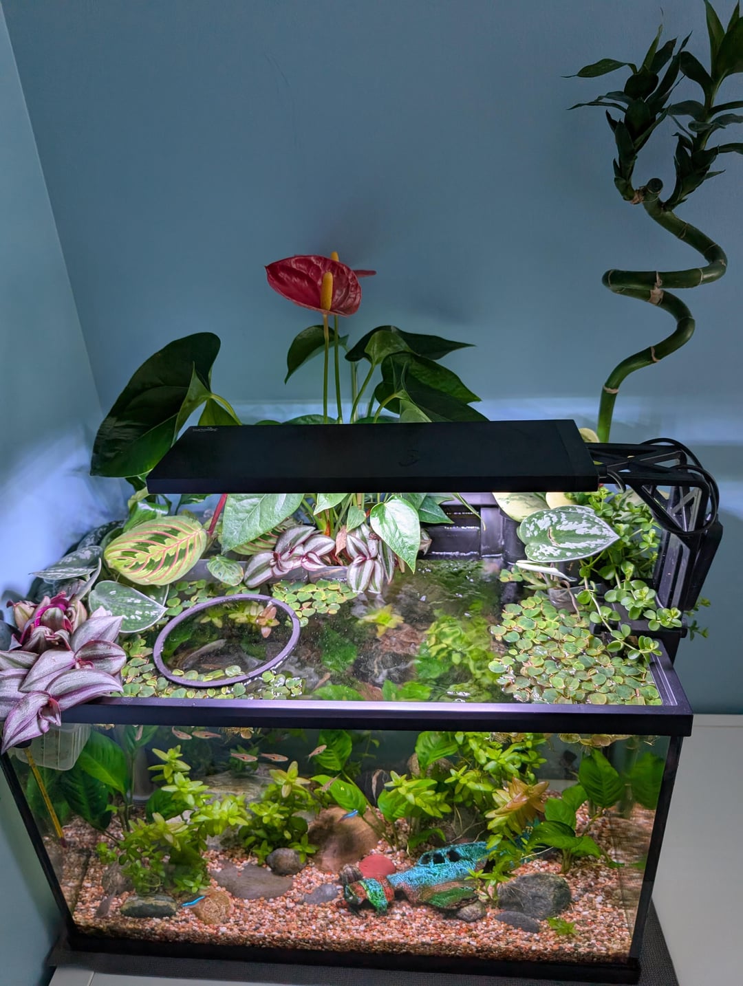 I switched out the lid/light for this Seaoura 20W light that has a cool "24hr mode" which is really just 15hrs on cycling through more natural sunrise,daytime,sunset,dusk light levels. Swapped out all the fake plants and decor for real stuff (with the exception of the crashed plane. This was just supposed to be a cheap little tank for my 5 year old.. ).