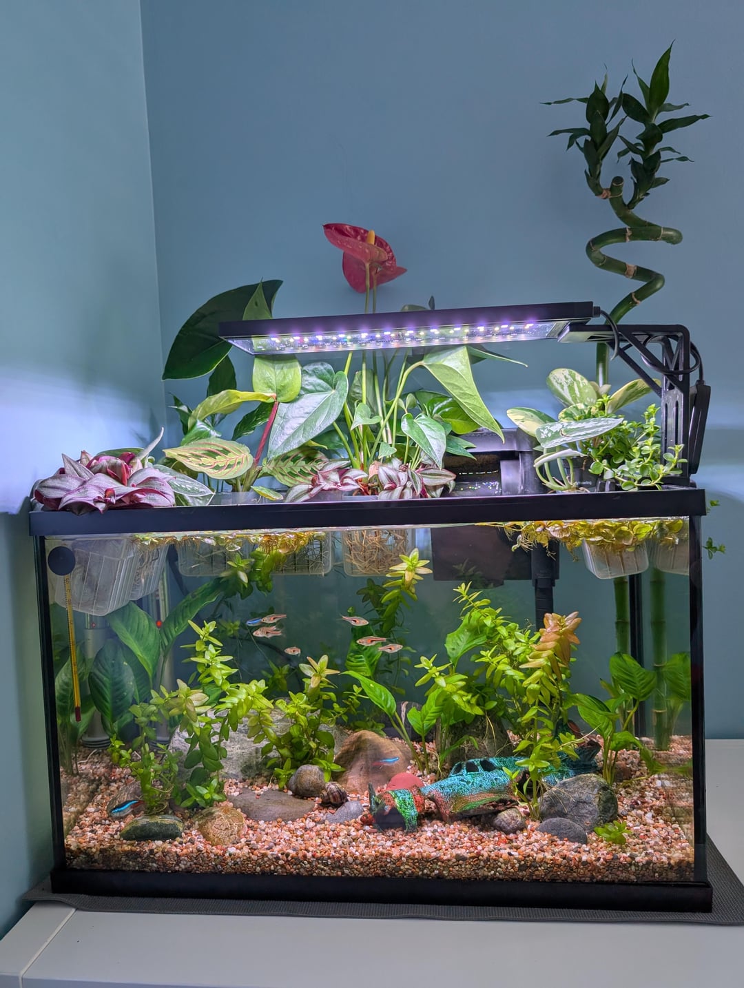 This may seem a bit off but the tetras are leftover, they were the first batch we put in a group of 6. And the Cory's unfortunately are 2 left of 4. I have to admit I really struggled with the water parameters for the first 6 months after cycling. Since changing over to real plants it's been very manageable albeit a bit overstocked I think but I just do more regular cleaning/water changes until the tetras cross the rainbow bridge.