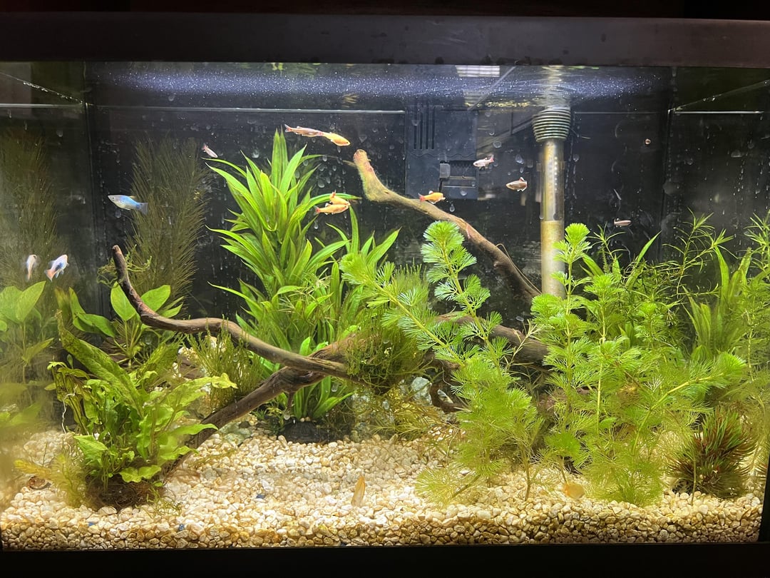 This 20g is currently home to 10 white cloud minnows, 3 female platies, 2 honey gourami, and 2 nerite snails plus some driftwood and a combo of fake/real plants. This will be my final stock unless/until I lose anyone. I just wanted to share for any other beginners out there, this is just a few months of progress!