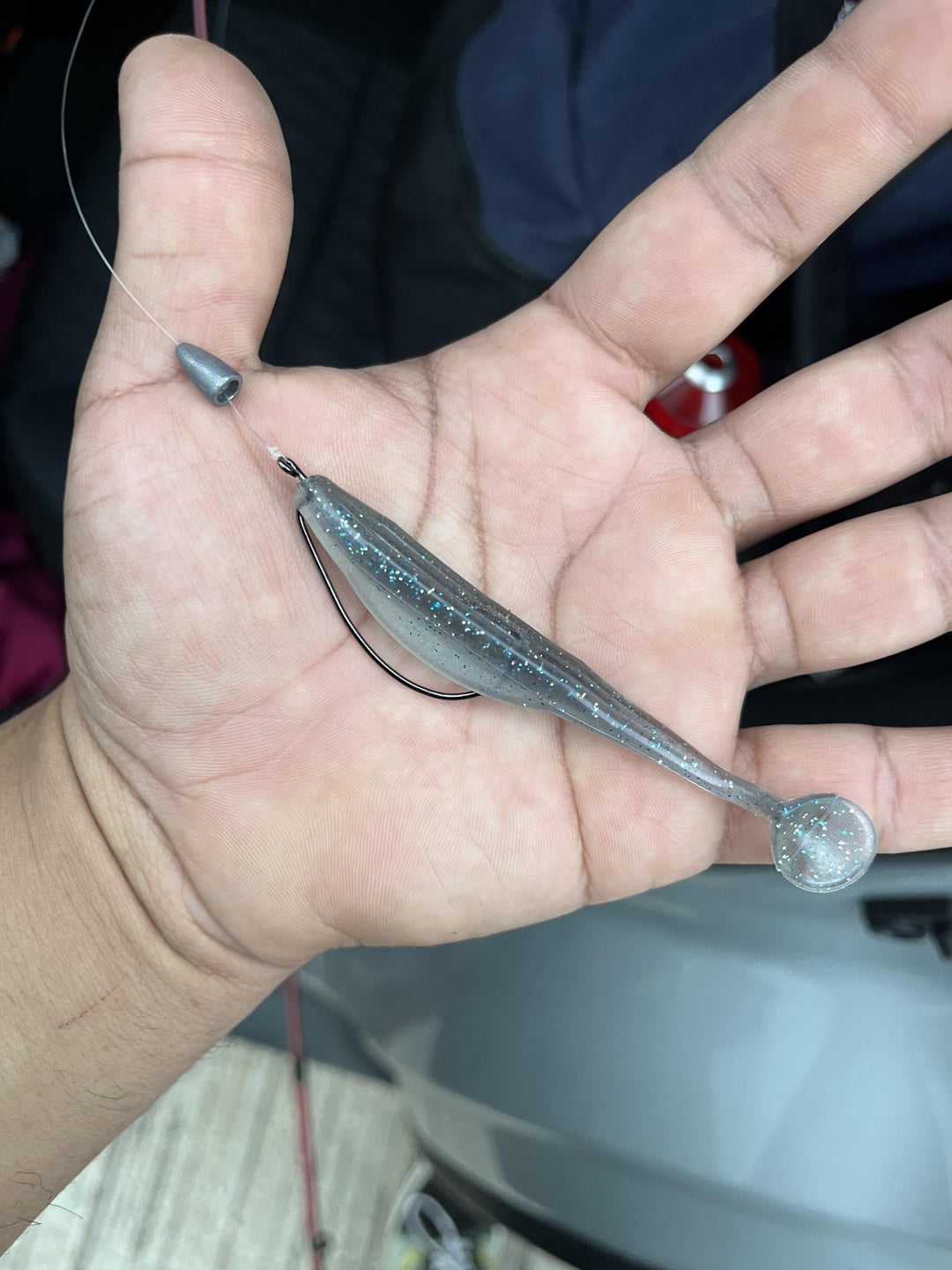 ( white ice) I feel really comfortable working that size of bait and got curious about this PaddleTail SuperFluke Jr. After an hour and a half finally caught this hog on that Paddle tail. On my couple of lasts cast.