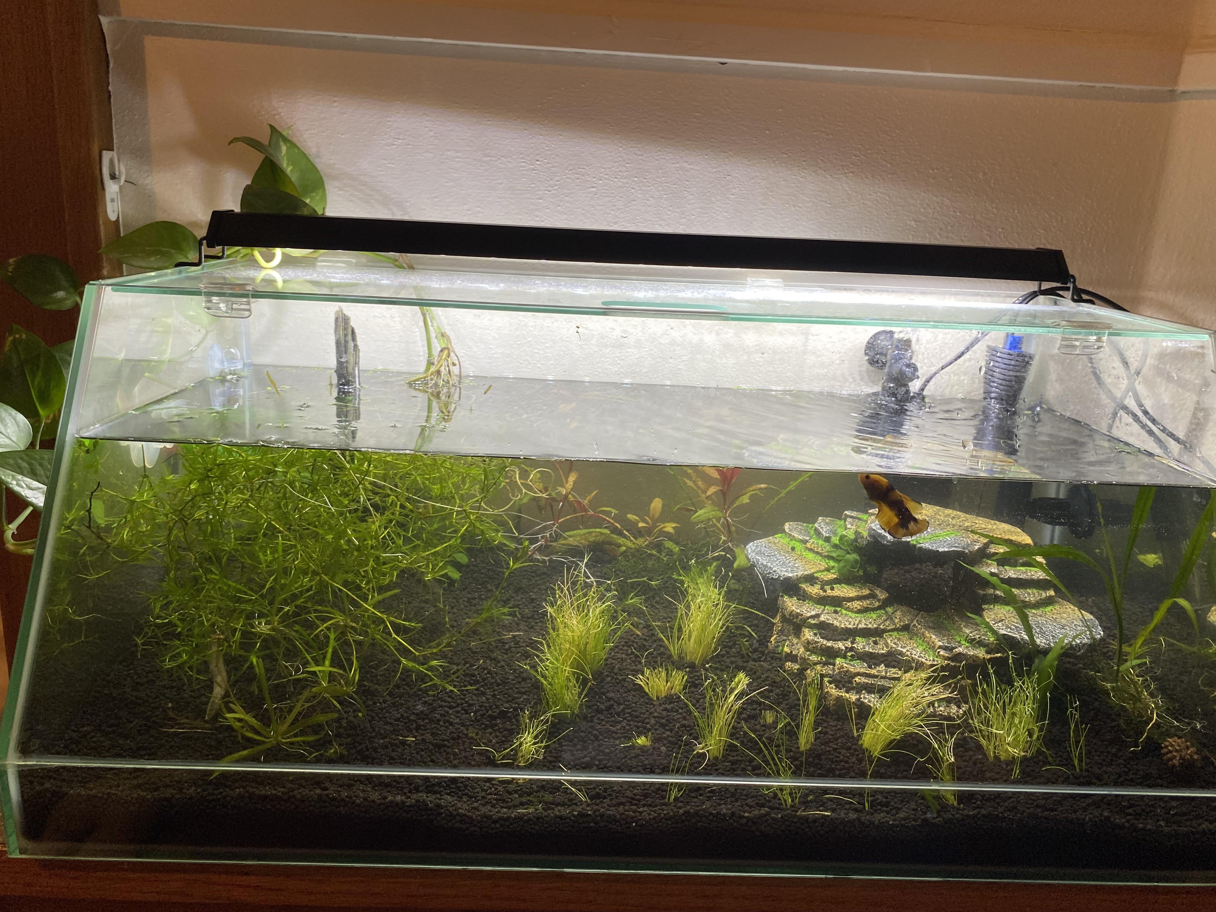 I had been eyeing this tank for awhile, and I know bigger tank can help stabilize Parameters. I basically transferred everything from the old tank to new- filter, substrate, plants. I read several sources that noted for the most part, I should be good since my bacteria were already in my sponge filter and substrate. Unfortunately, My shrimp were the canary in the coal mine and perished, so I waited to add my betta for a few days.