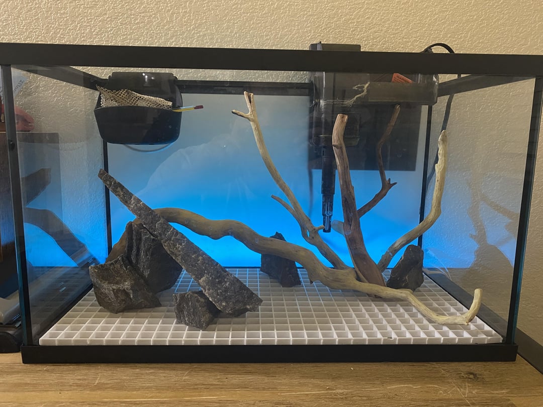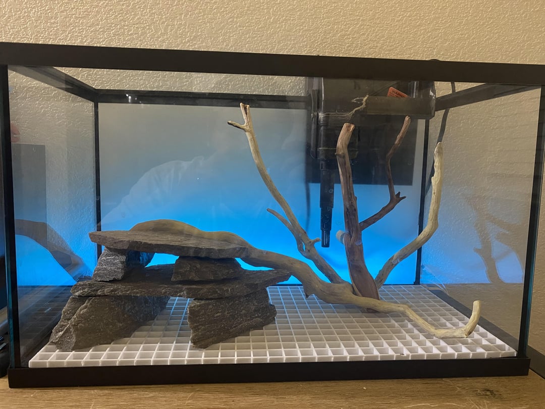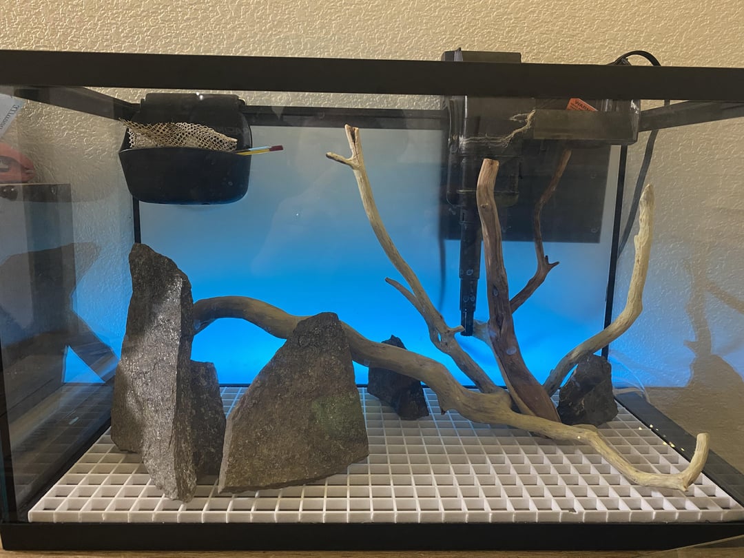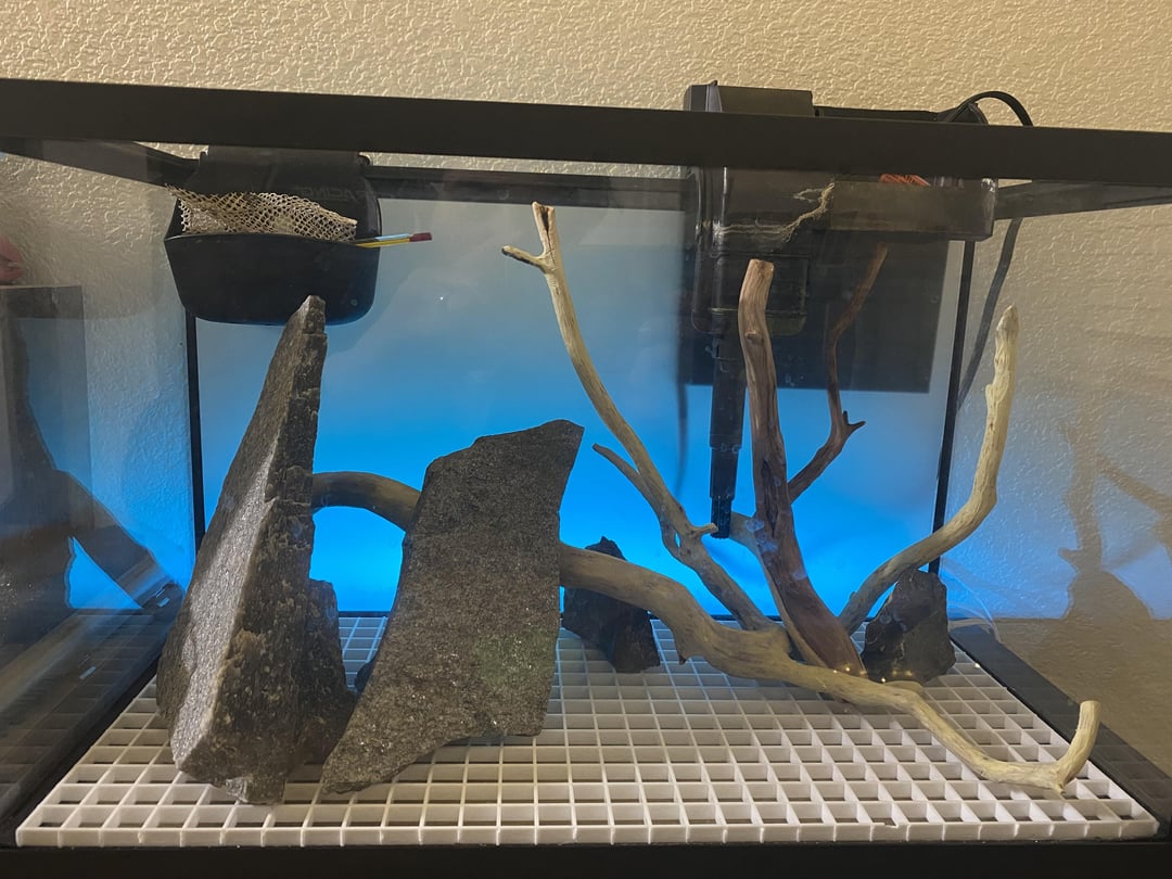 Setting up a 10g tank with all free stuff (manzanita and flagstone from neighbors, leftover substrate, old filter, plant cuttings, and other stuff I found around the house) – working with what I got.