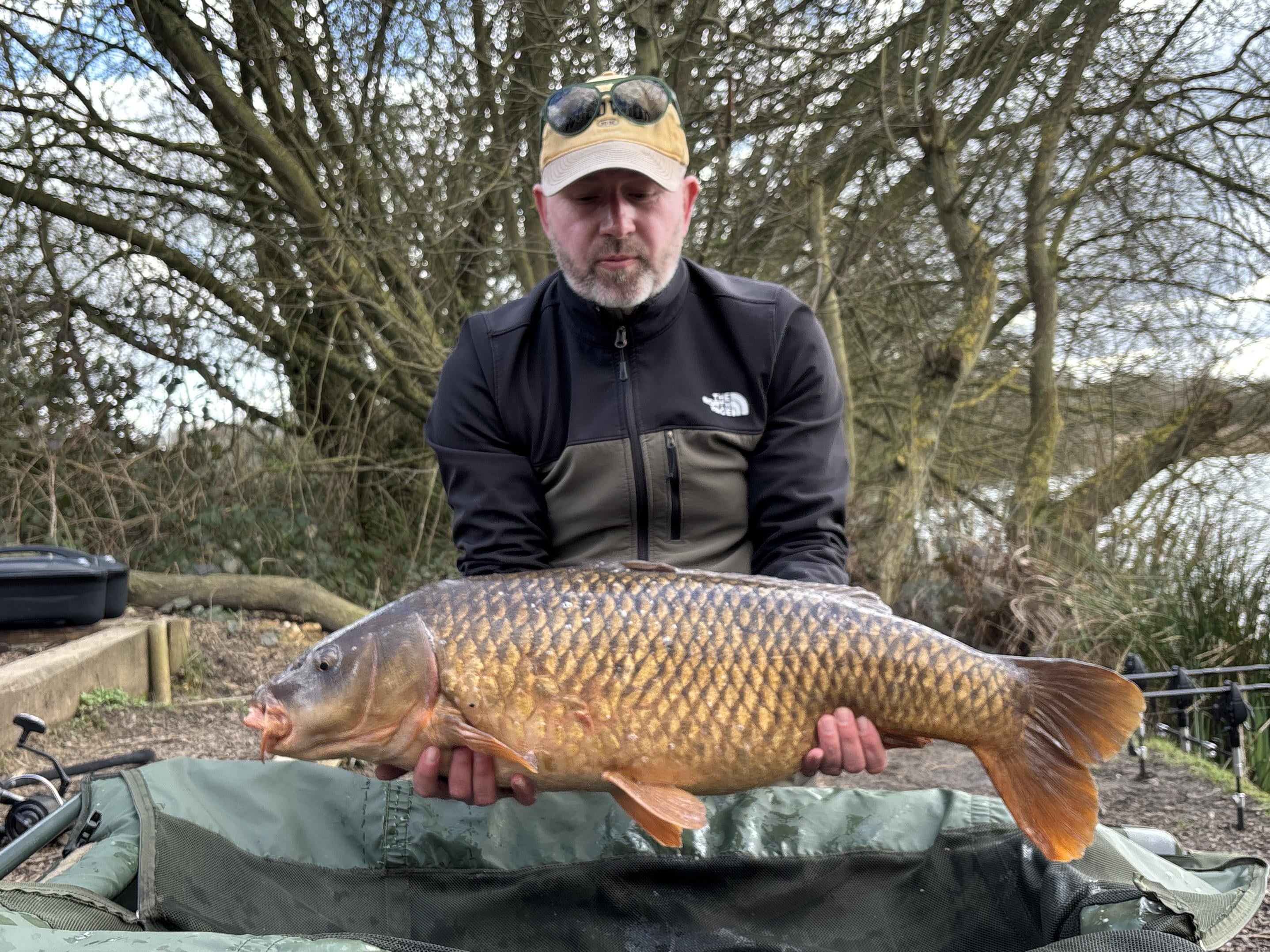 Cold wind, bit of sun, saw this lump leave the water on the far margin. Sent out the boat, German rig with a pink popup and some crushed up bottom baits. Went off before the alarm was even switched on! Spring is in the air. 23lb 3oz. First fish from a new lake.