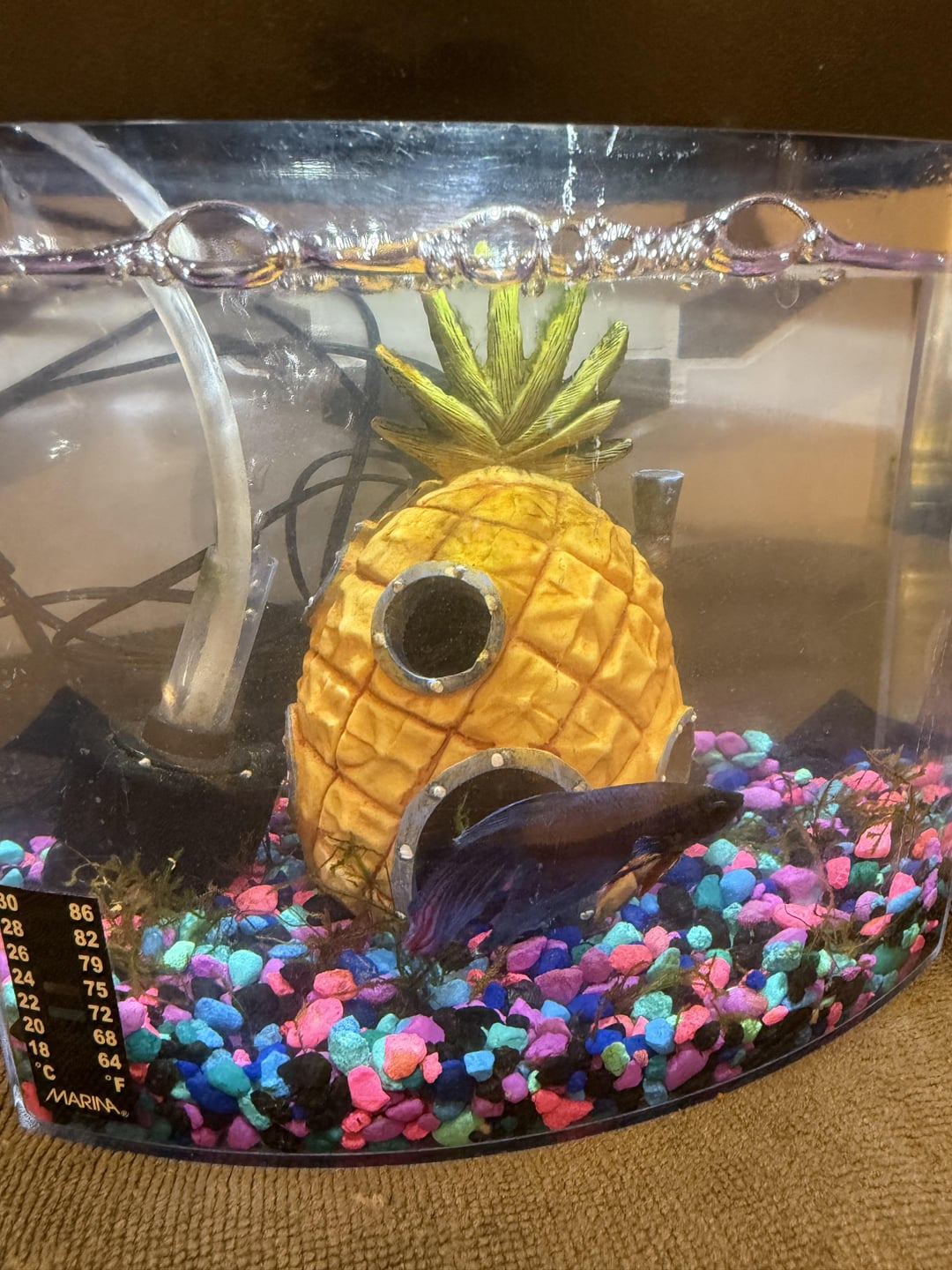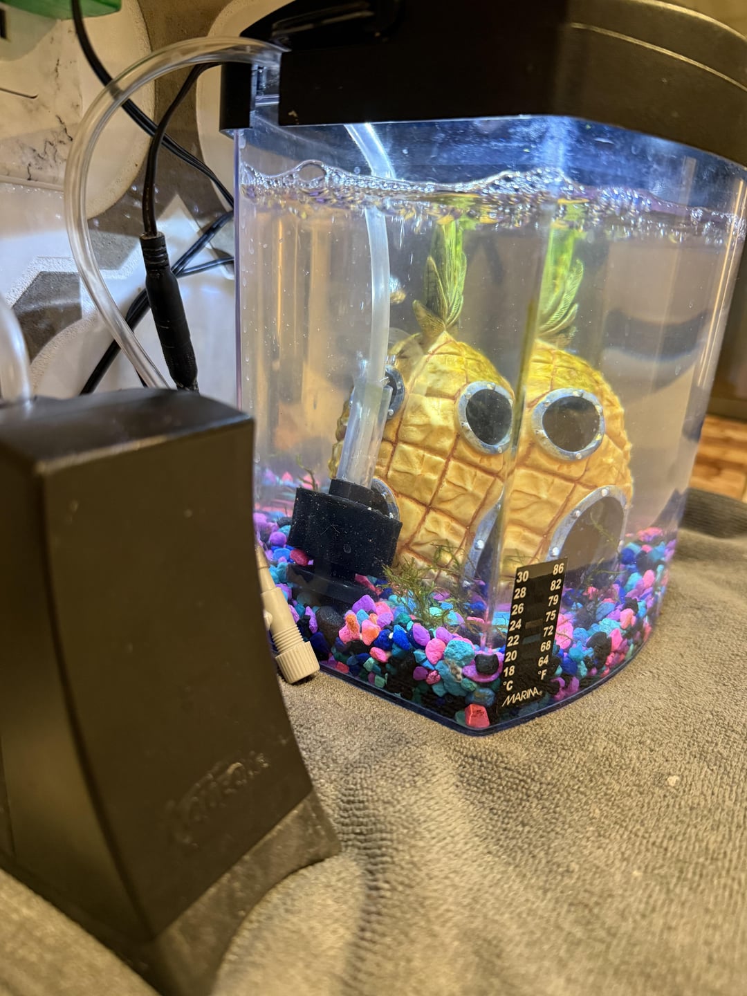 So for context around 6-8 months back my little sister’s teacher gave her this. My micro fish tank my filter, decor, pump, timer. But their fish. I’ve started doing water changes of 50% monthly as they rarely do it. I added java moss today because this poor guy has no where to hide. My sister came home from a party a few weeks ago with goldfish and I’ve been learning about the nitrate cycle, cycling the tank and so much more.