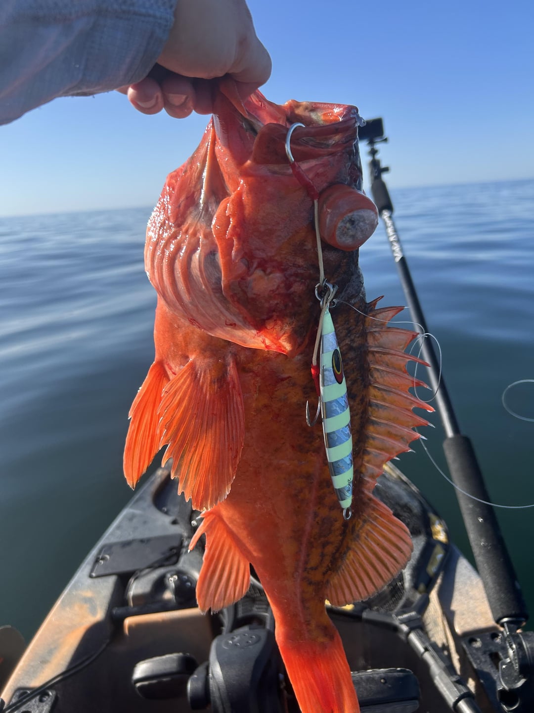 Got out on yak for the first time since my newest son was born a couple months ago. Little 8 mile round trip. Got a new slow pitch set up and went out to a rockfish spot I had found in the winter. California rockfish opened for all depths April 1. Fished in 300-350 feet with a 200g Nomad Gypsy on 30 lb braid with 3 feet of 40lb Fluor leader. Immediately got smoked on the drop and got limits of Vermilion (2). Absolute blast.