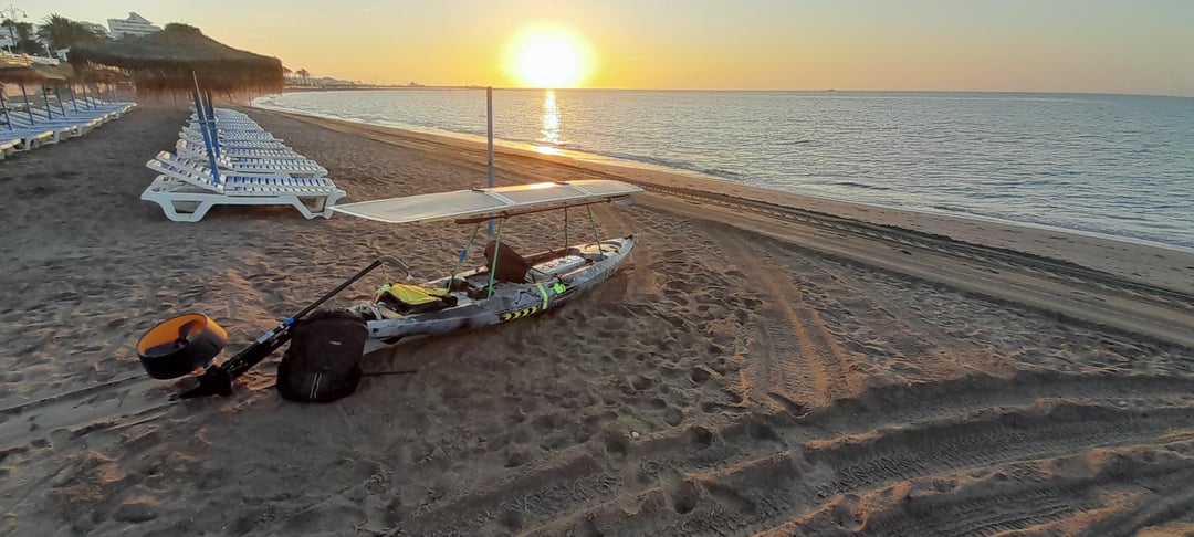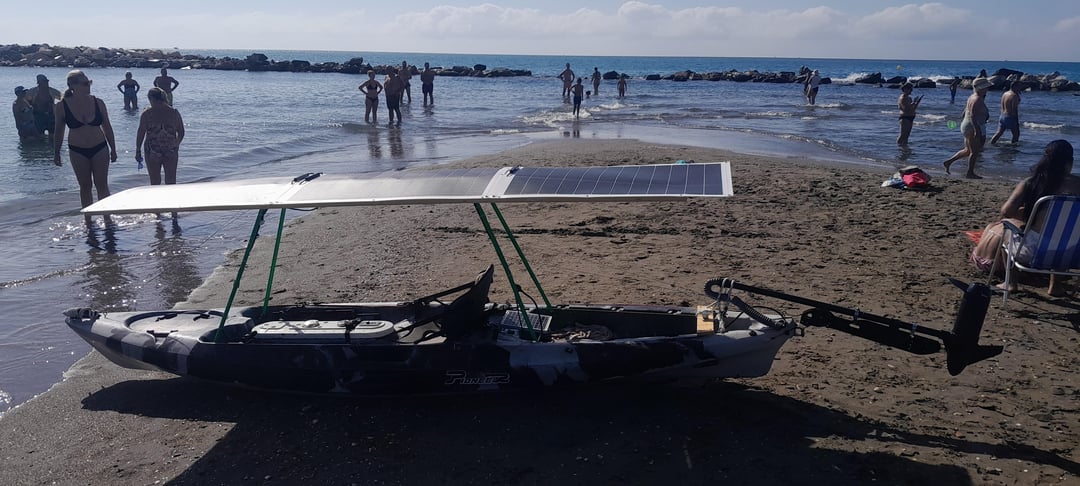 This is my solar powered fishing kayak, it is still a work in progress. It has no batteries and relies solely on the panels – I live in the south of Spain and I only fish during the day. Even during cloudy days it propels me faster than I could paddle and also for a lot longer, in august we recieve 10 hours of strong sunshine. In total there is almost 600 watts. In my most recent test late last summer I completed a 40 kilometre round trip in the space of about 5 hours. The panels are 12 volts with a 12 volt speed controller in front of the sitting position for forward, reverse and power control (white panel) and also a 12 volt trolling motor mounted on the rudder. It is currently in my back garden undergoing upgrades.