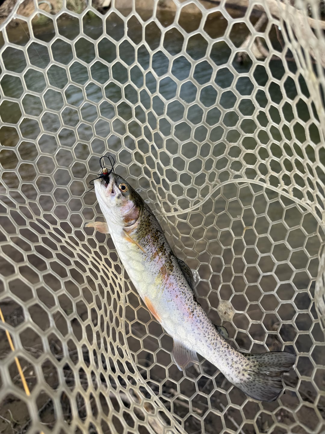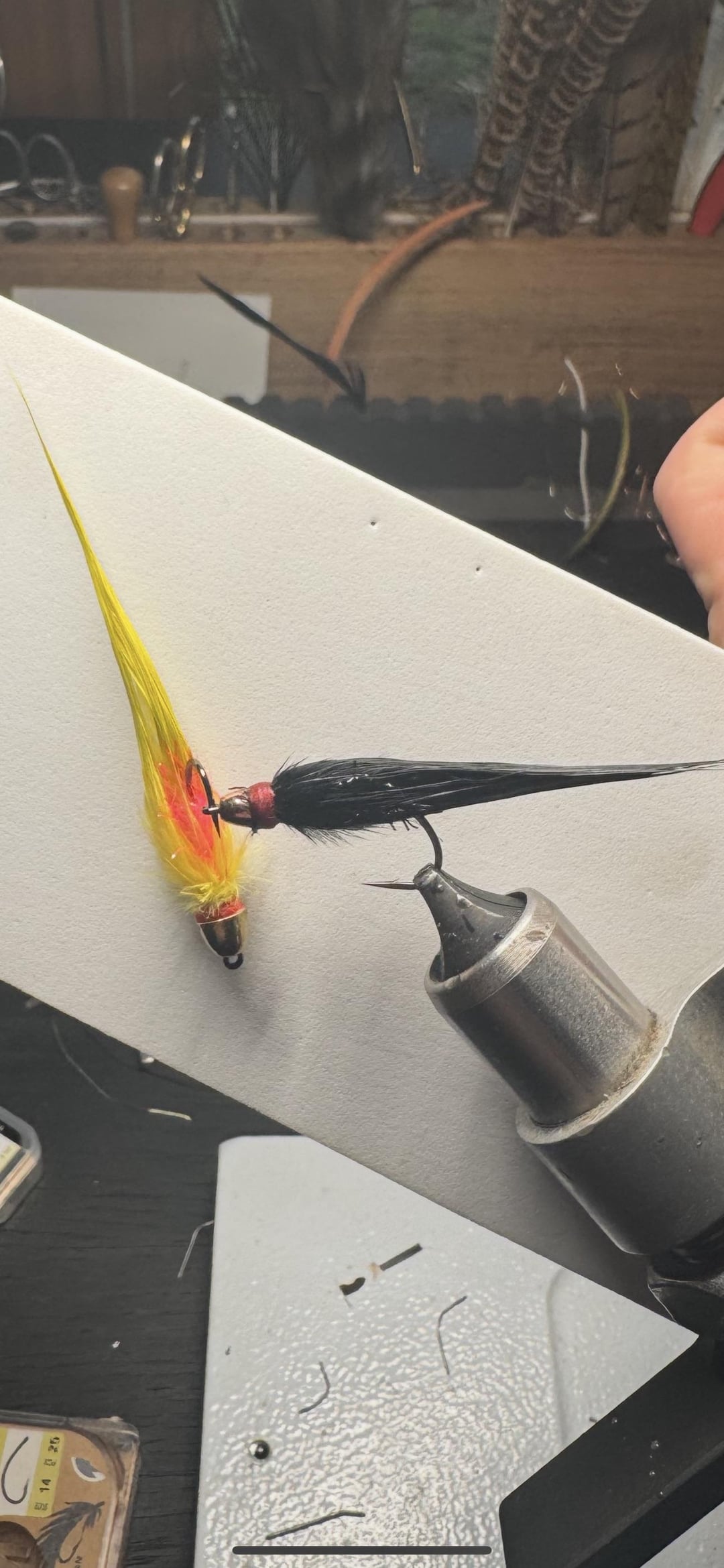 Pretty tricky to have an original thought in the fly tying world, that being said I’m pretty sure nobody else is tying a fly like this. Recipe is a 6/0 stinger hook, tungsten cone with a tungsten bead behind it, tip of a marabou feather for the tail, base of that same feather for the collar and micro stragglestring for the body.
