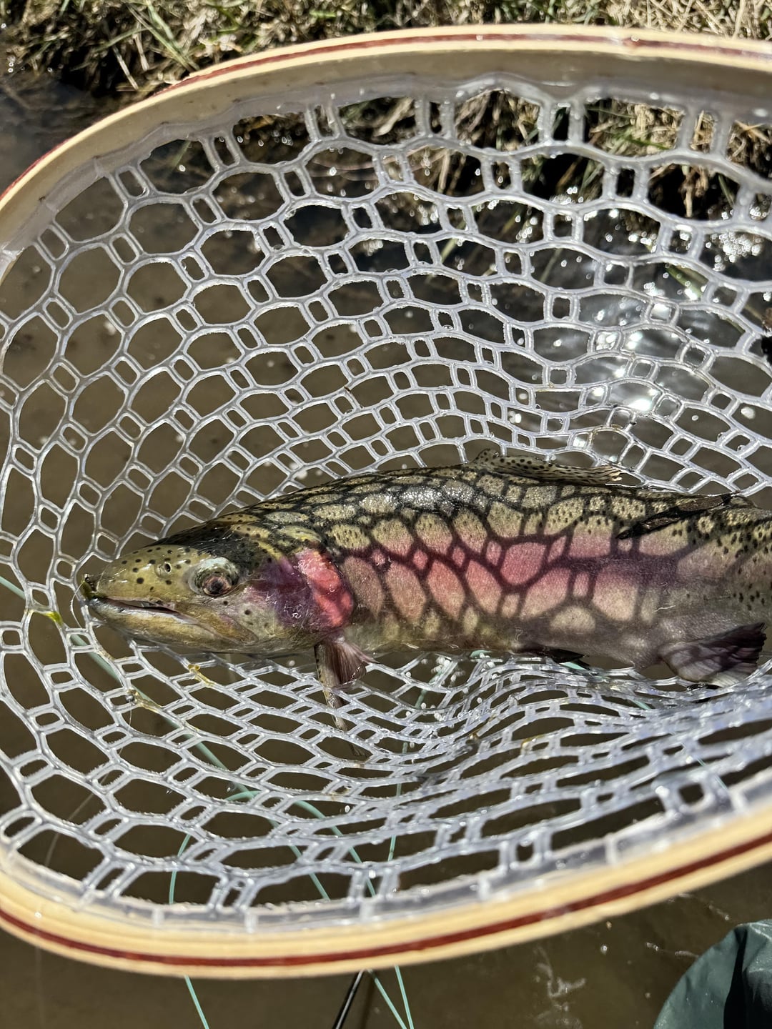 I’m new to fly fishing, and it’s been very frustrating. But I finally landed my first trout, and a he’s a beauty. On a copper john in Bear Creek. Posted by Weird-Frosting563