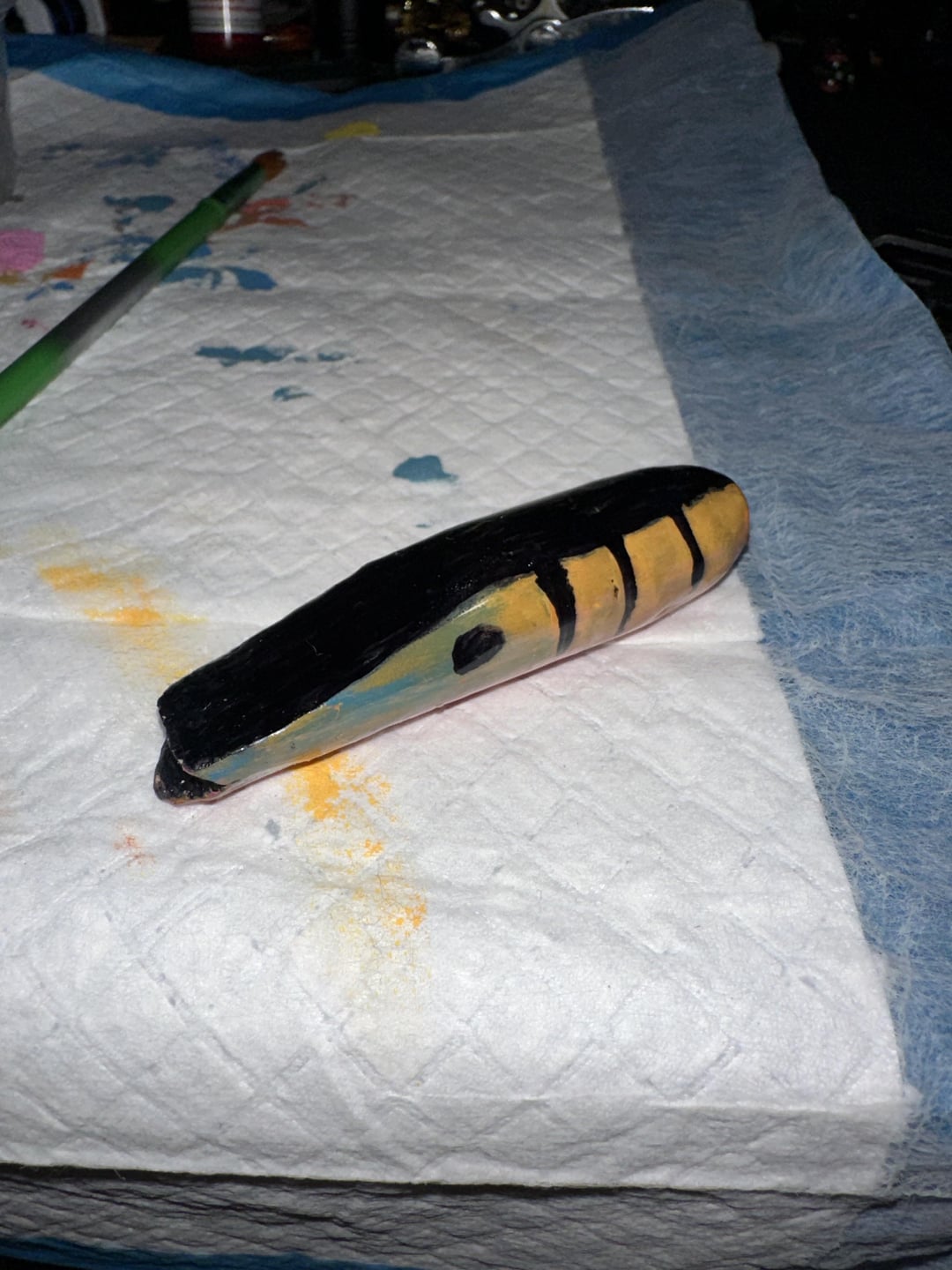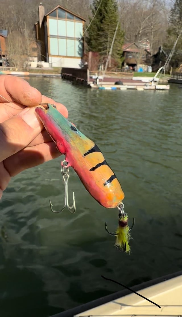 First off I’m aware it looks a lil rough lol. This is my mini rendition of a Super Strike Darter by Don Musso, one of the most deadly striped bass plugs of all time…so I carved this up, painted it, tied the flag on the tail hook and went for a test run at a river couple months back in the winter and saw a big brown trout follow it so I knew it was money, within 5 minutes of twitching this around at my local lake today I got one to bite😁😁felt so cool… it acts like a underwater spook, except it suspends when u pause and digs when u crank it. Super deadly!