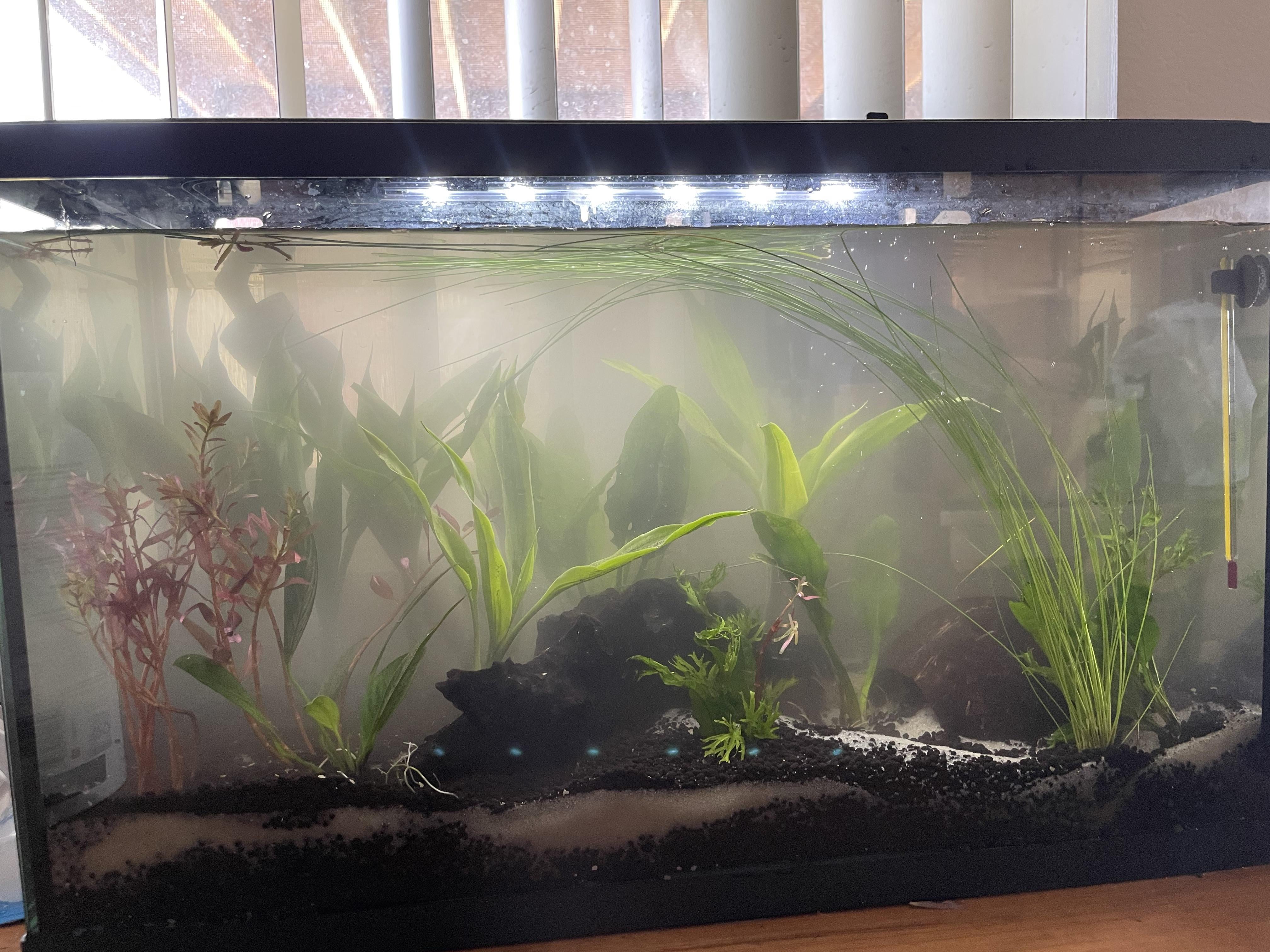 I got this new tank for a betta fish. I don’t have the fish yet as I’m letting it cycle first. This is how my tank looks. I went too overboard with the pants and now I’m worried it’s too crowded. This is my first time setting up a fish tank. It’s a ten gallon and I have a variety of plants like gold ribbon, anubias, Amazon sword, etc. I also have driftwood and a little coconut shell hide (let me know if I should take it out) I have my filter running, as well as a heater and thermometer. I used fluval stratum and some sand. It should clear up in a few days. If this gets much attention, I’ll post an update. 🙂