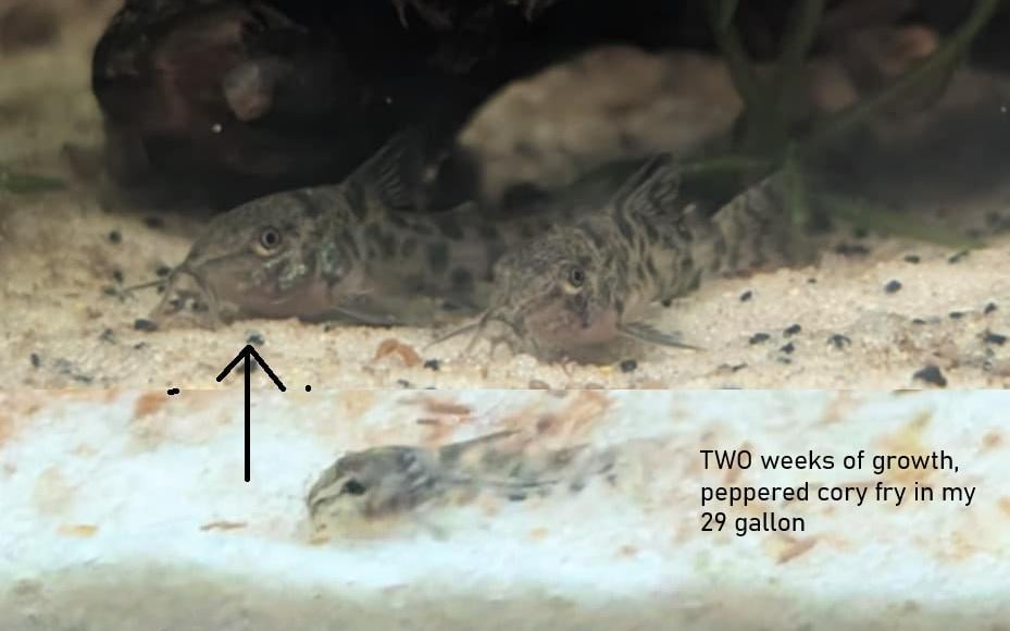 Two weeks of growth on my peppered cory fry. yes only two. They grow like weeds. 29 gal tank, sand bottom.