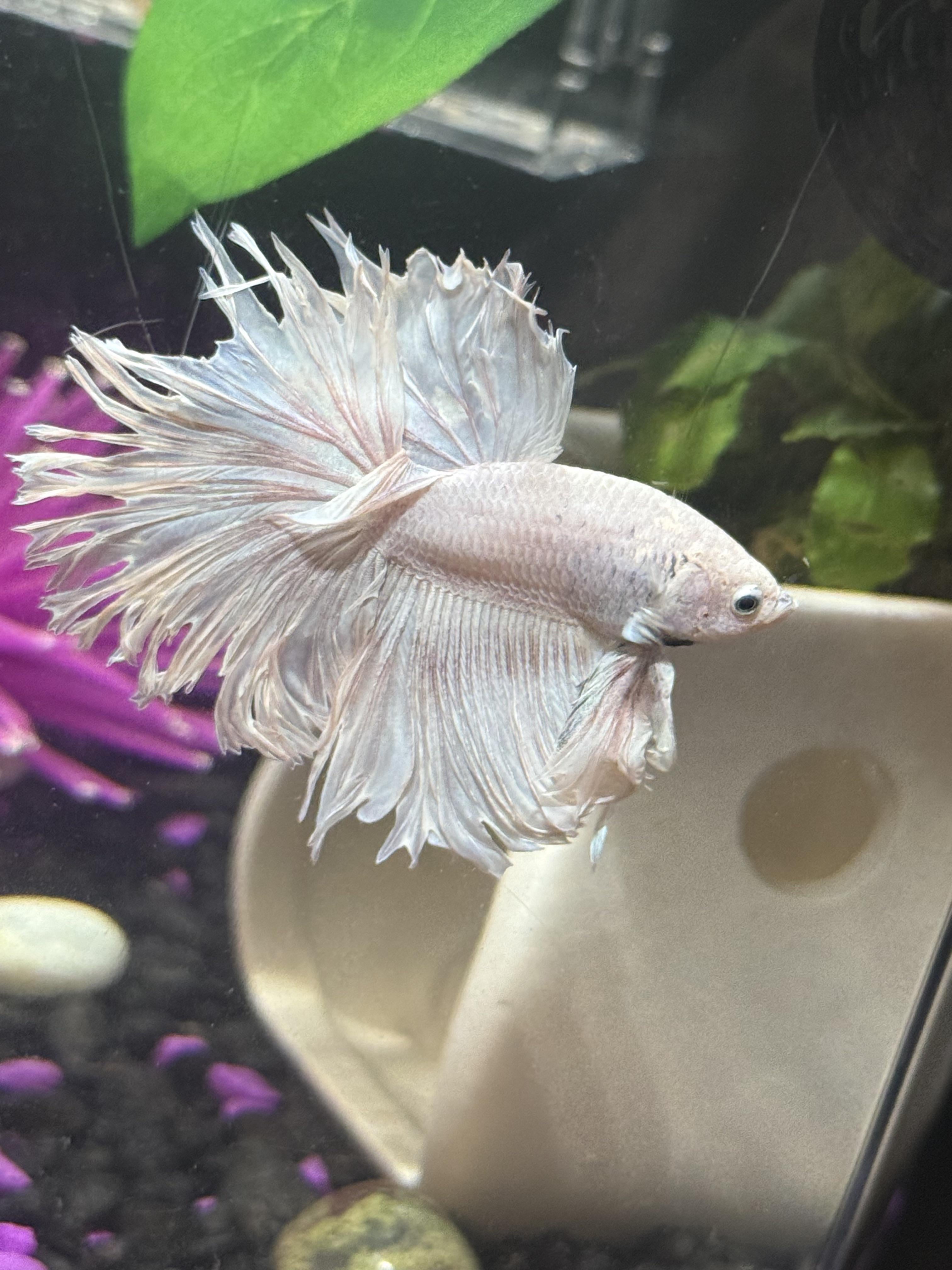 Zero was completely white, skinny, lethargic and didn’t want to eat when I got him. He is now a healthy eater, happy making bubble nests and gained some pink color.