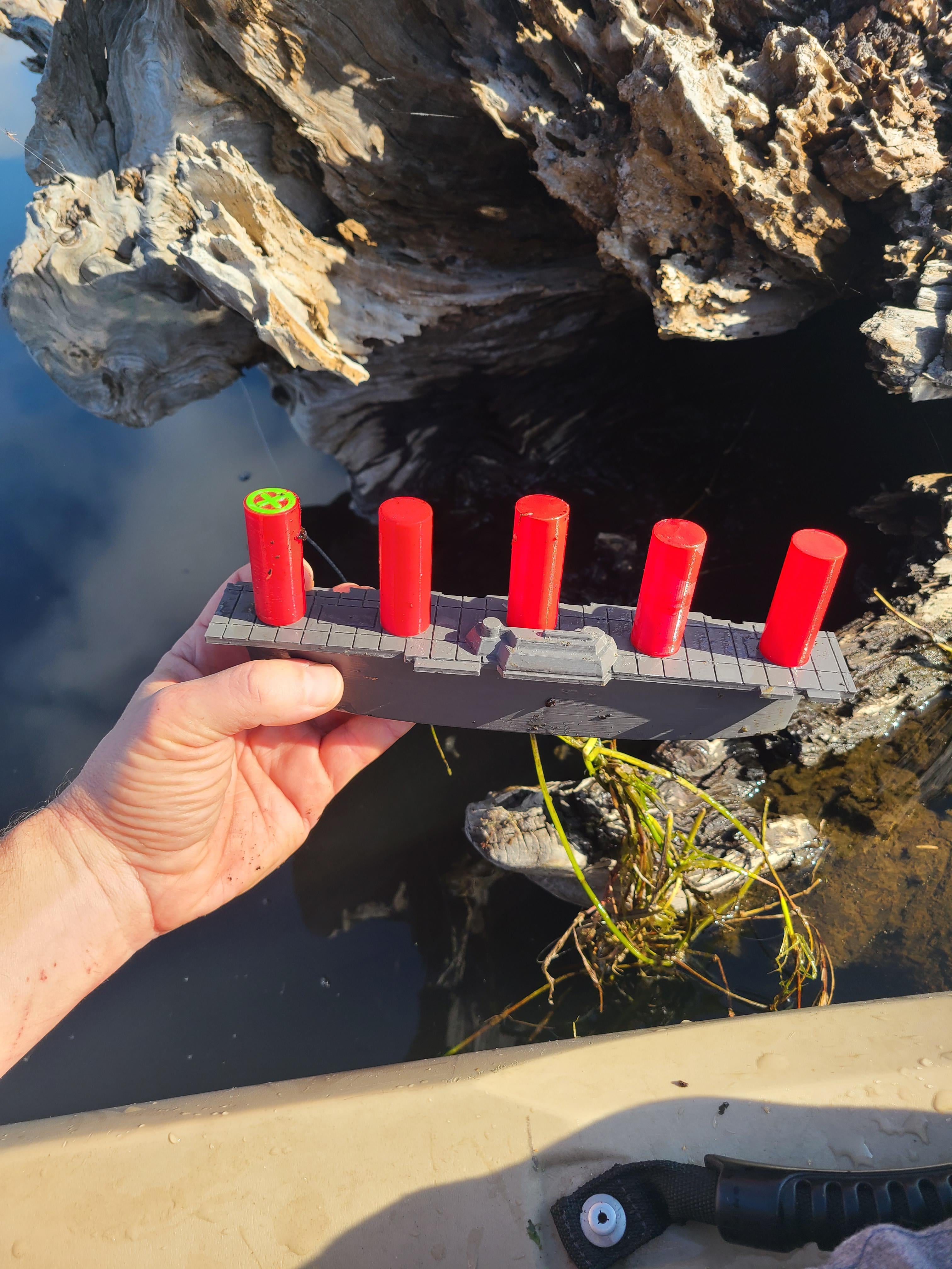 Found this stuck in logs with some line attached. It's a carrier from Battleship, about 10 inches long. Not much traffic on this lake, so I'm assuming it was just pulled behind someone's boat to keep the kids entertained. No hooks on it. Strangest thing I've found so far.