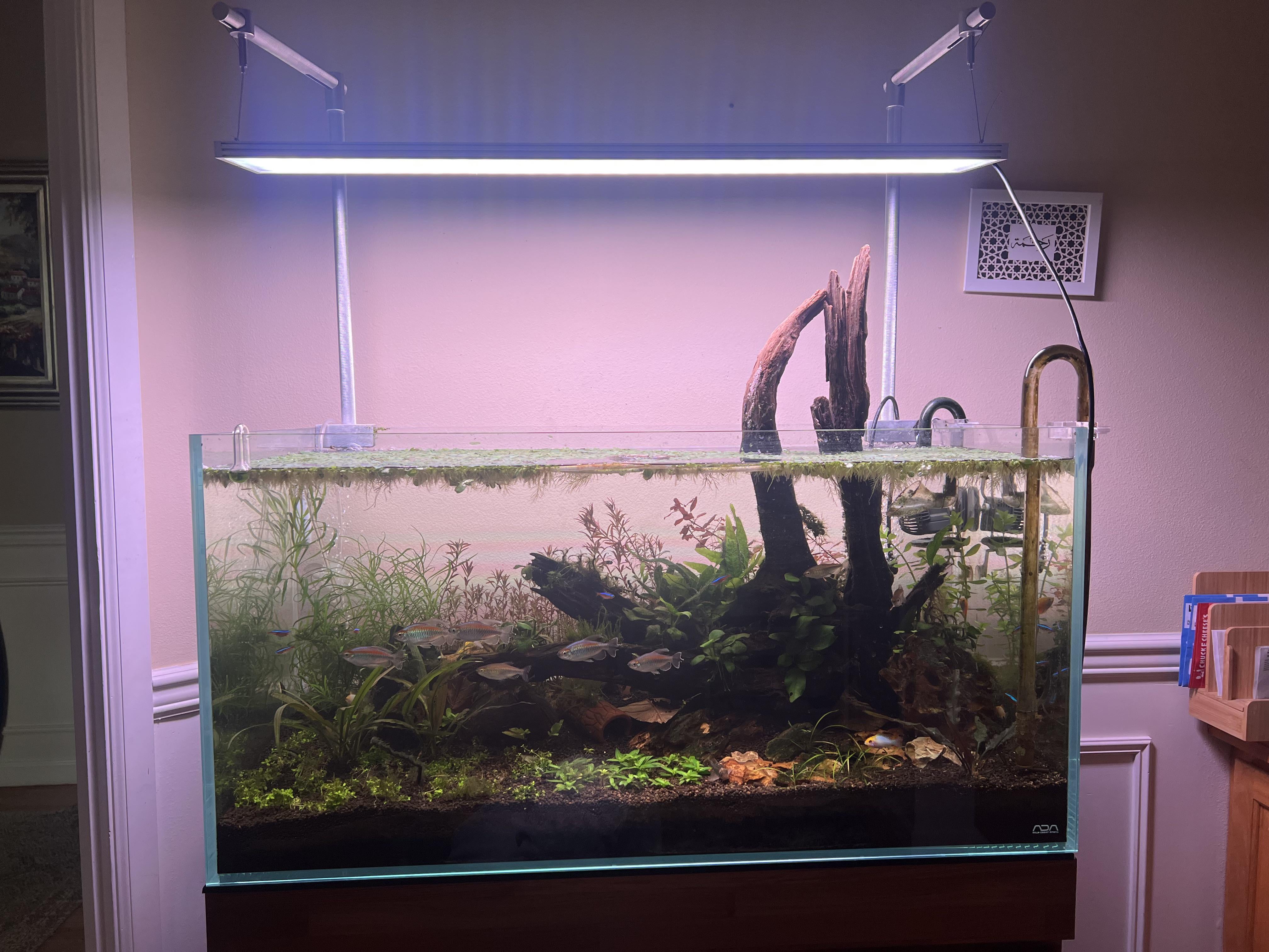 Running this ADA 90p (roughly 40 breeder) tank. Plants are still filling in, but they’re mostly decor for the livestock