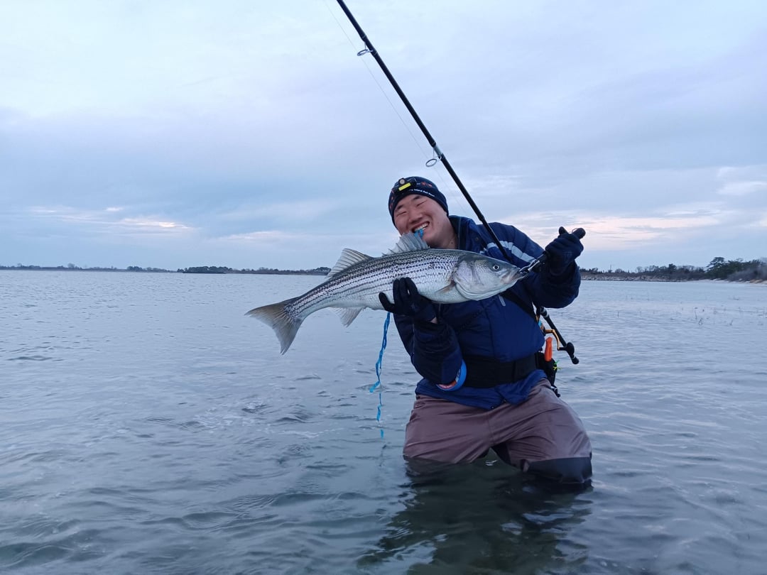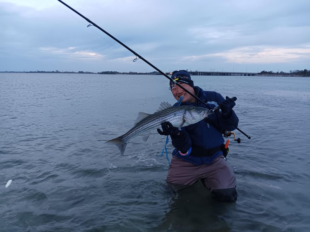 A 36ish inch, 20lb striped bass caught on a spook. Water temps was high 40s and I have no idea how I caught two of these things. Grabbed a photo of one because why take a pause for a photo when the bite is on. Anyway hope to see more this year.