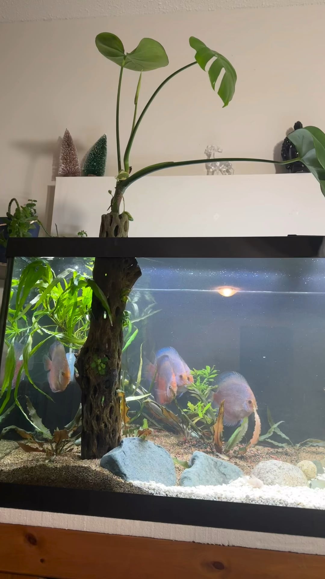 Hey fellow fish keepers , I just recently did a tank upgrade and a rescape for my 6 – year old discuss. These guys are slowly acclimating to the new scape and the new pecking order in the beginning got a few of them scraped and they even lost some scales, which they are all now recovering from. I am looking for suggestions to upgrade the scape to be a bit more aesthetically pleasing as it is my show tank. That being said, I tried a different approach with the Cholla wood trying to get it upright to make it look like a cholla wood forest and the white path is supposed to end at the back of the tank giving it the illusion of depth, although I feel like I’ve somewhat failed the task but not on a massive scale. I am planning to add some rotala into the tank as these guys love to eat plants even though they are fed 5-6 times a day, they have eaten both the types of wisteria, now red leaf ludwigia, and would even try to eat the Val! 😂🤣. So I’ll give it a shot with some rotala that I have in another tank and maybe even some Java fern.