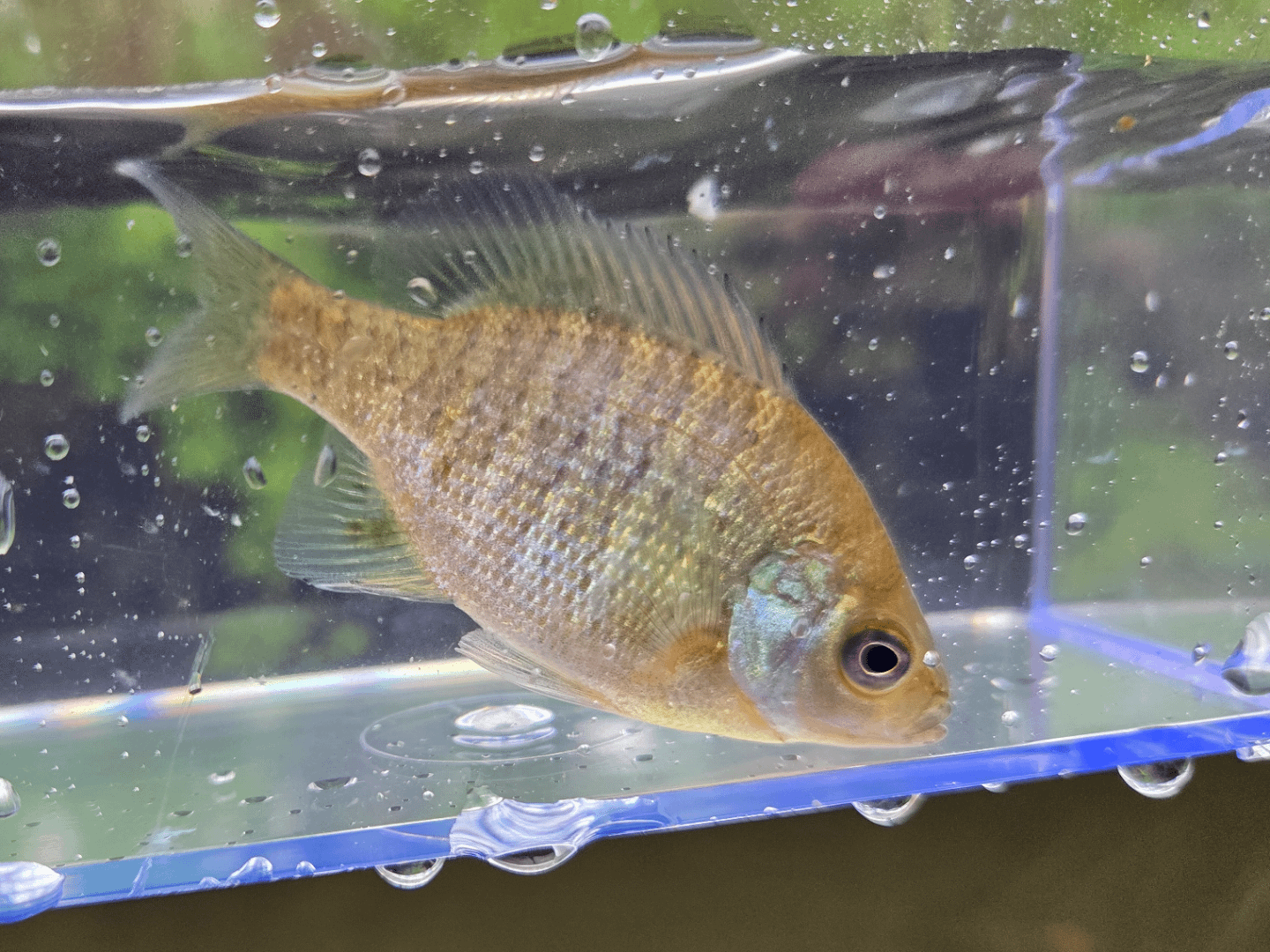 I have a hard time telling with the little guys sometimes – but the strong barring on the side and spots on both the dorsal and anal fin point to Bluegill (hybrids always possible too I suppose).