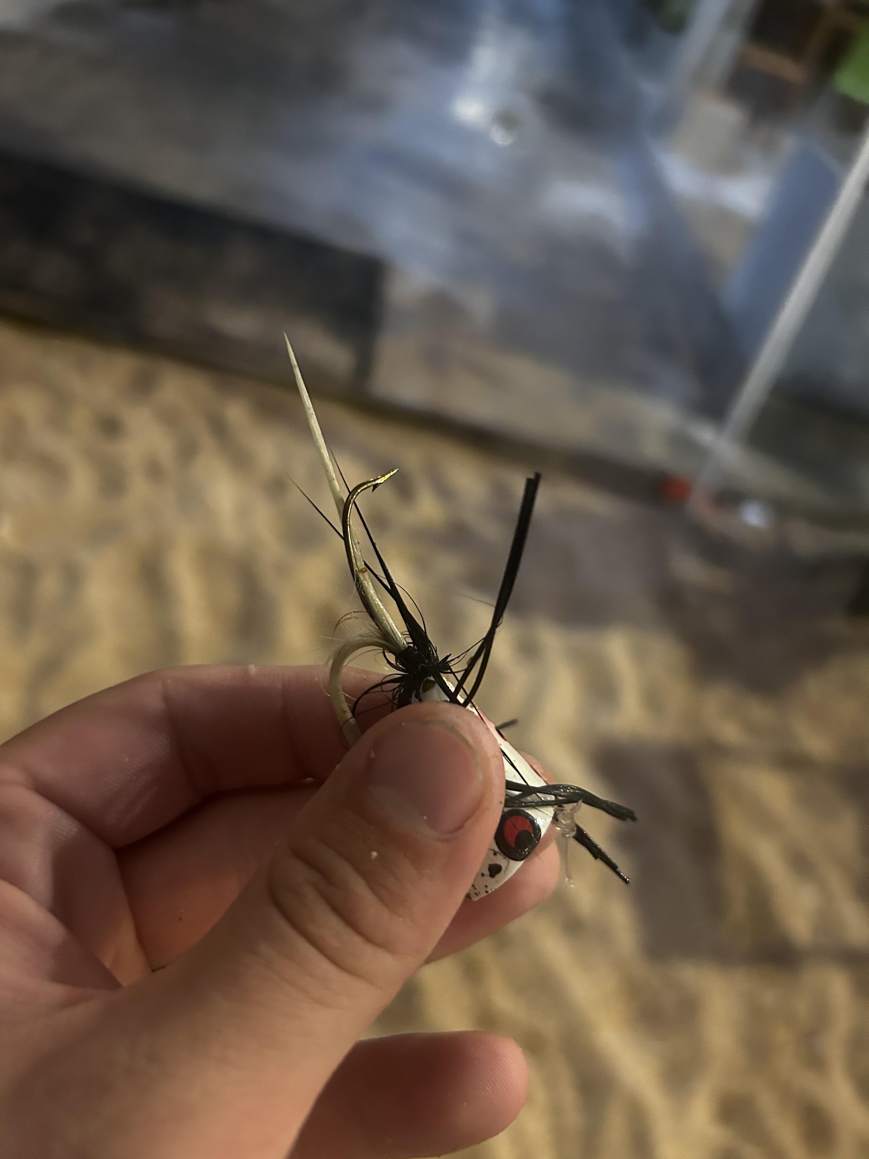 Very nice size GT came up and annihilated my popper a couple hundred yards from shore. Took off like a rocket ship and almost spooled me on the first run. After a few minutes of fighting the line went limp and I reel in to find a bent hook.
