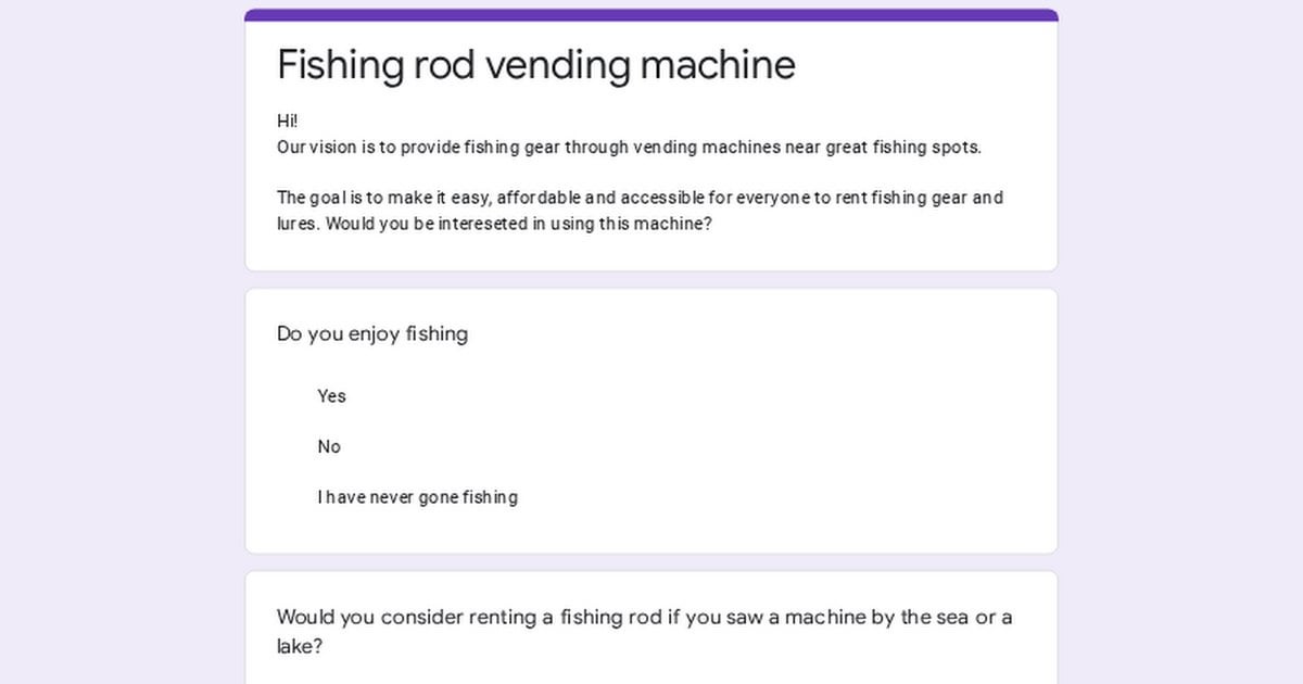 I've been discussing the idea of fishing rod vending machines, placed by good spots for fishing. So beginner beginners who don't have their own rods can get into fishing. This short survey covers more on the idea, and we really want more fishers opinions, to know if there's any point in this business idea at all