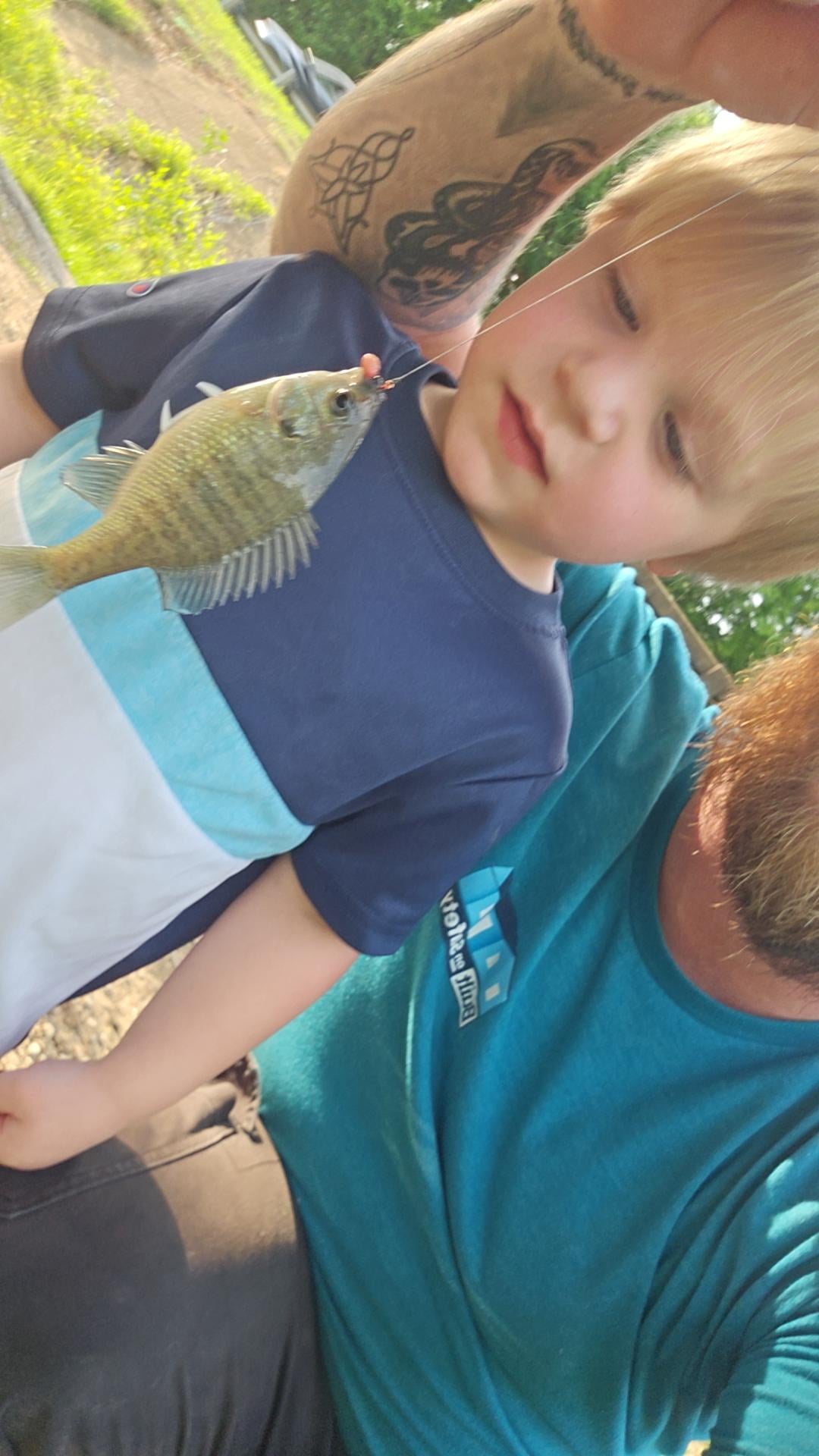I had a micro hook on it that I use to catch bait mostly and went to a spot that always has a bunch of hungry bluegill. He couldn't quite figure out the reeling aspect but he hooked it! Future angler in the making!