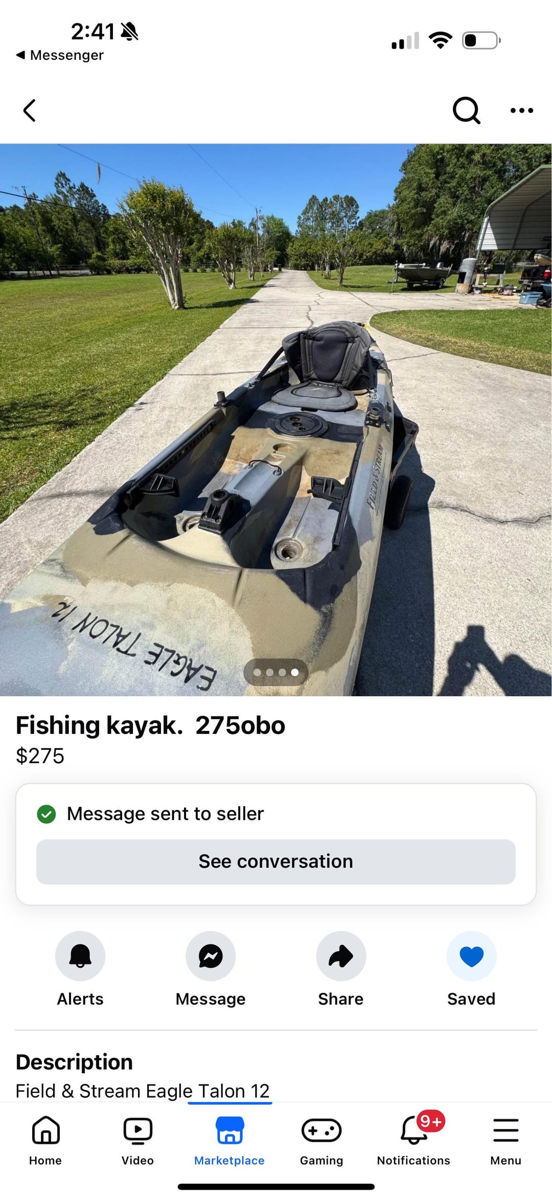Found on Facebook for 275 got it to go down to 200 this will be my first kayak I plan on mostly fishing on clam waters did a lil research and said to not be the best for fishing if anyone knows another kayak that would be better I have a limit of 400