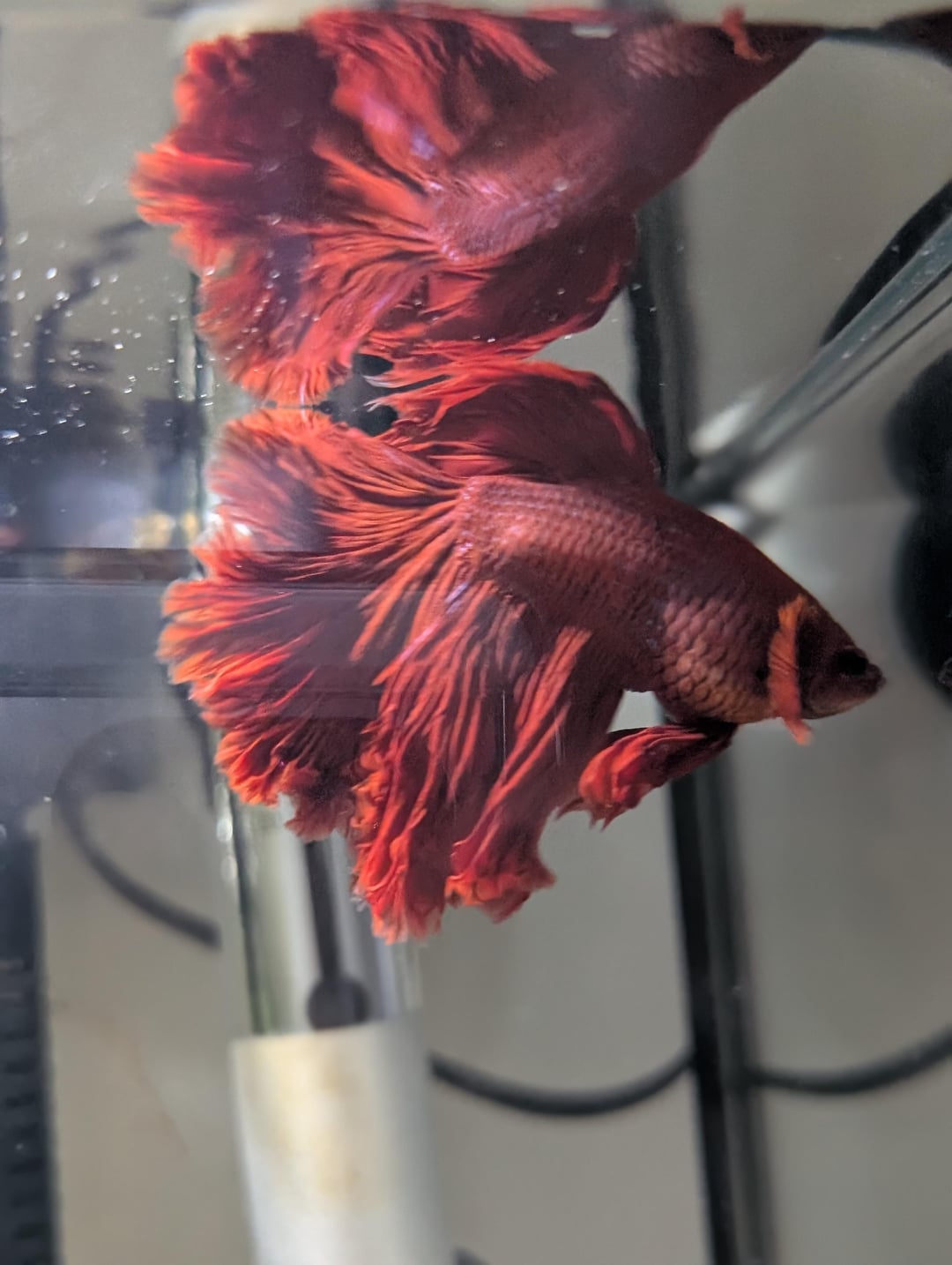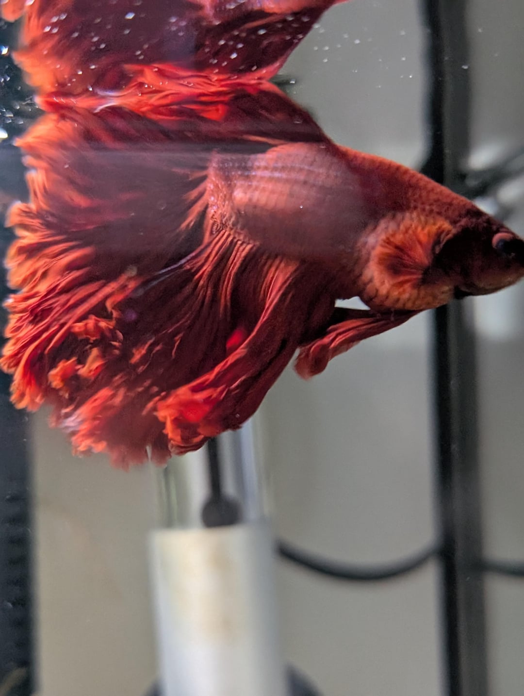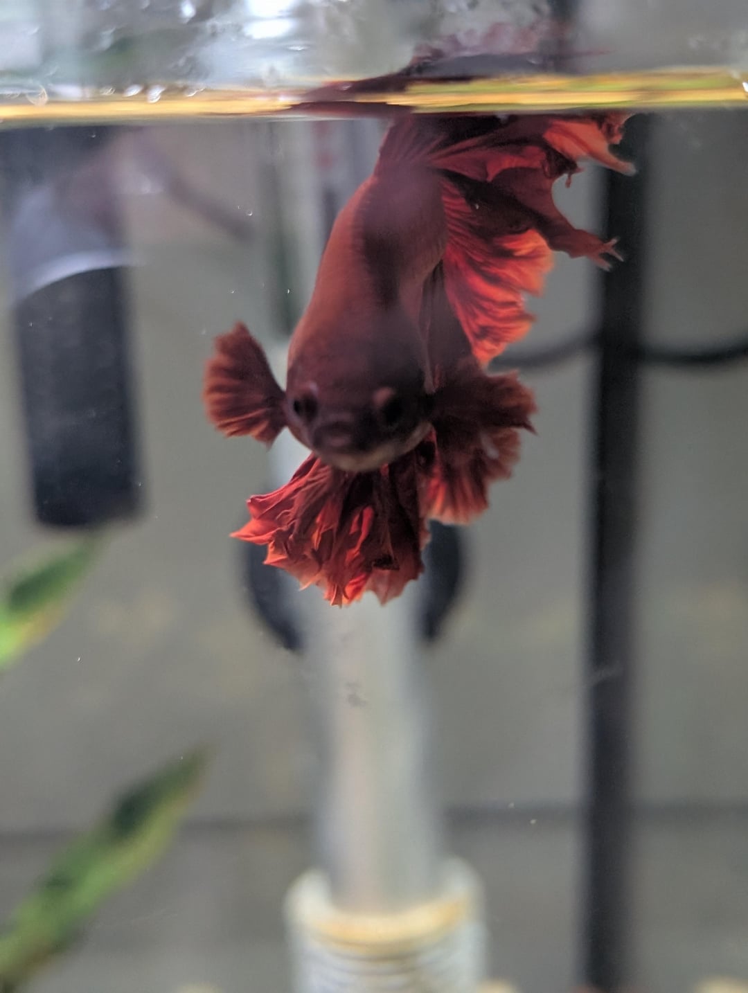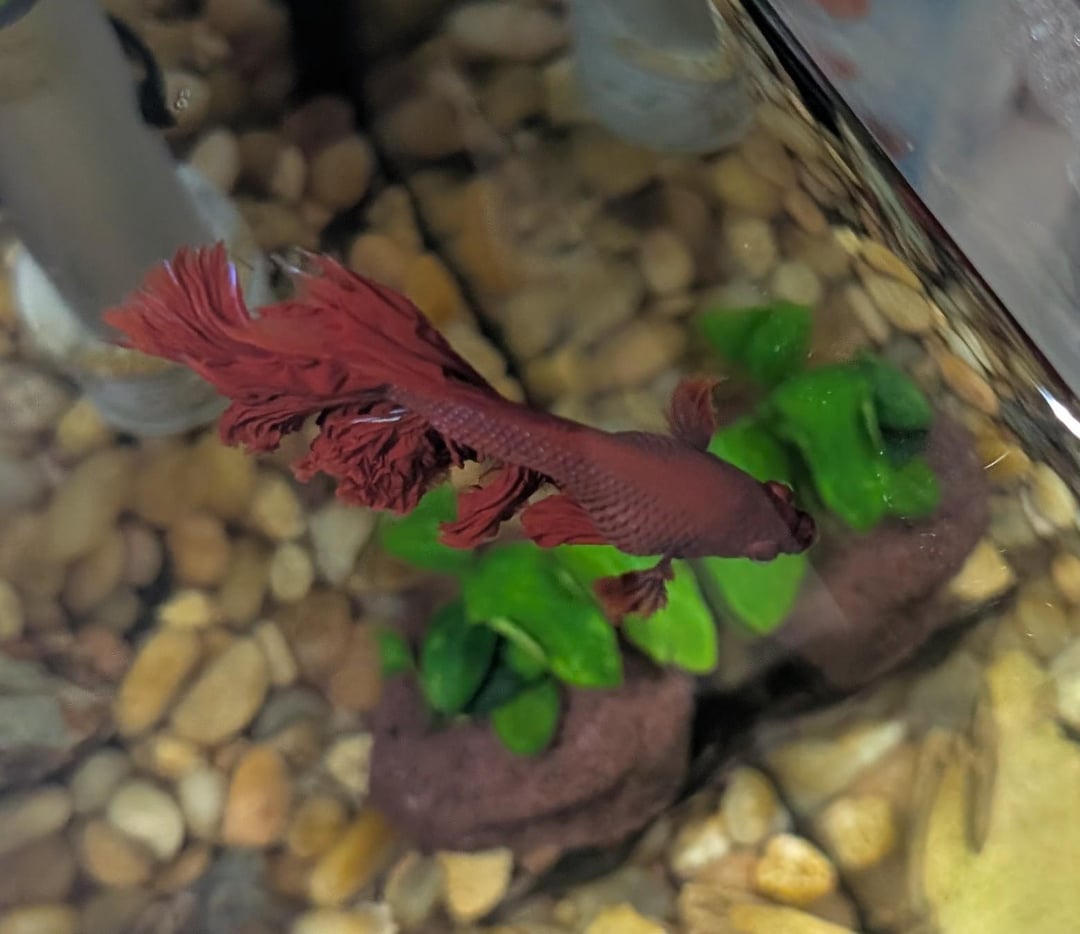 Ph is 6.8ish, 0 ammonia, 0 nitrite and between 5-10 nitrite. Temp is like 81. 10 gallon tank with real plants and 1 silk plant, 1 mystery snail. Food is fluval bug bites betta formula.